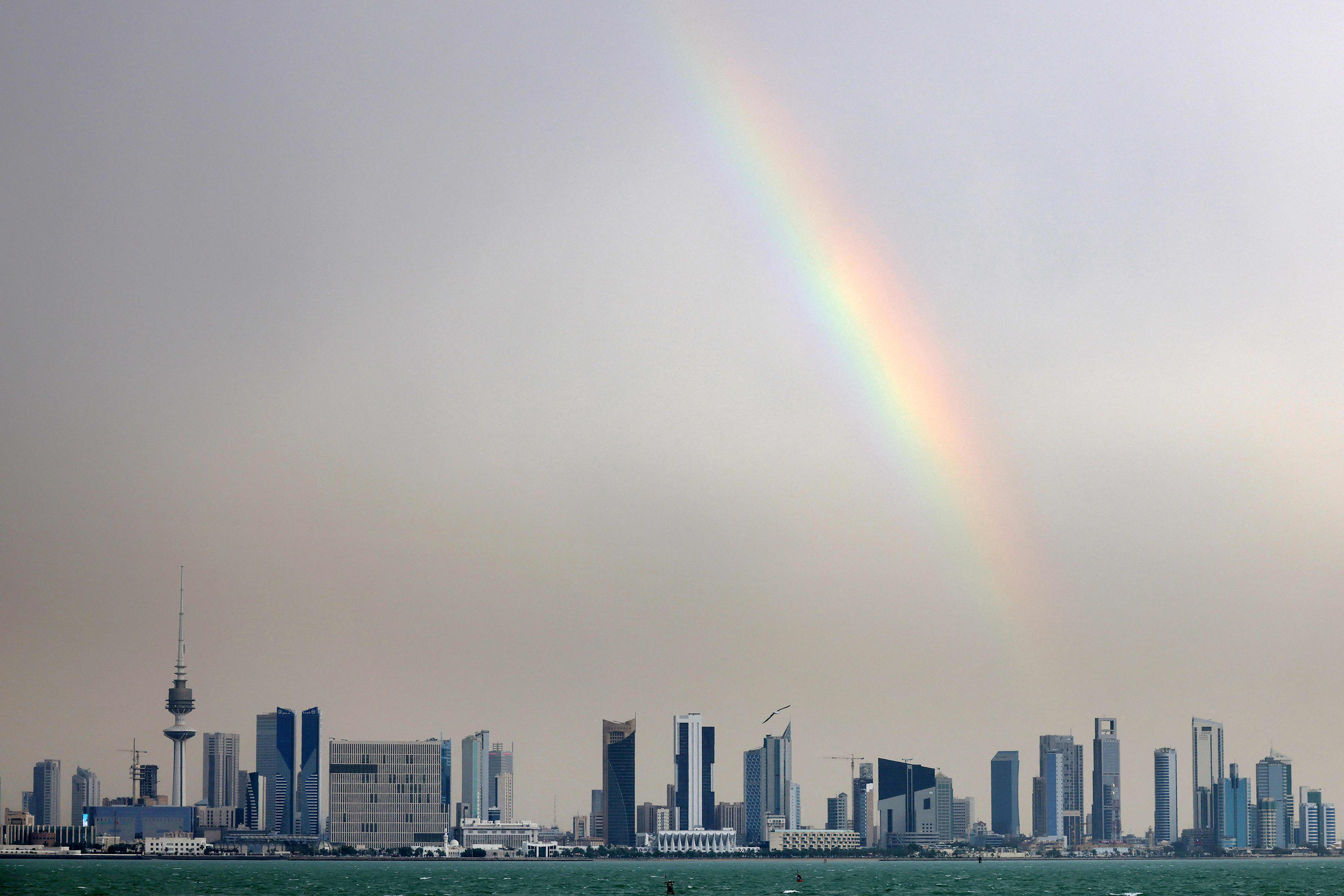 A rainbow is pictured after heavy rain above the skyline of Kuwait City on May 13, 2024. (Photo by Yasser Al-Zayyat/AFP Photo)