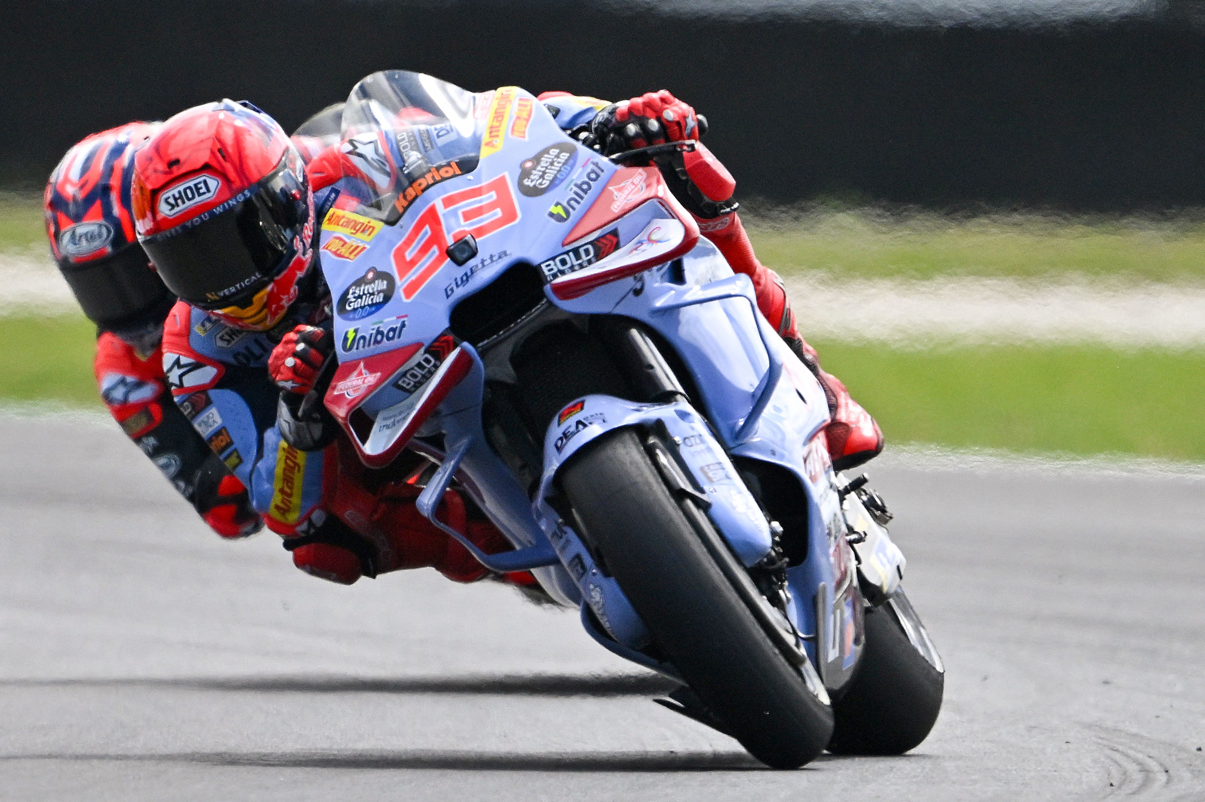 Gresini Racing MotoGP's Spanish rider Marc Marquez powers through a corner during the MotoGP Australian Grand Prix on Phillip Island on October 20, 2024. (Photo by Izhar Khan/AFP Photo)