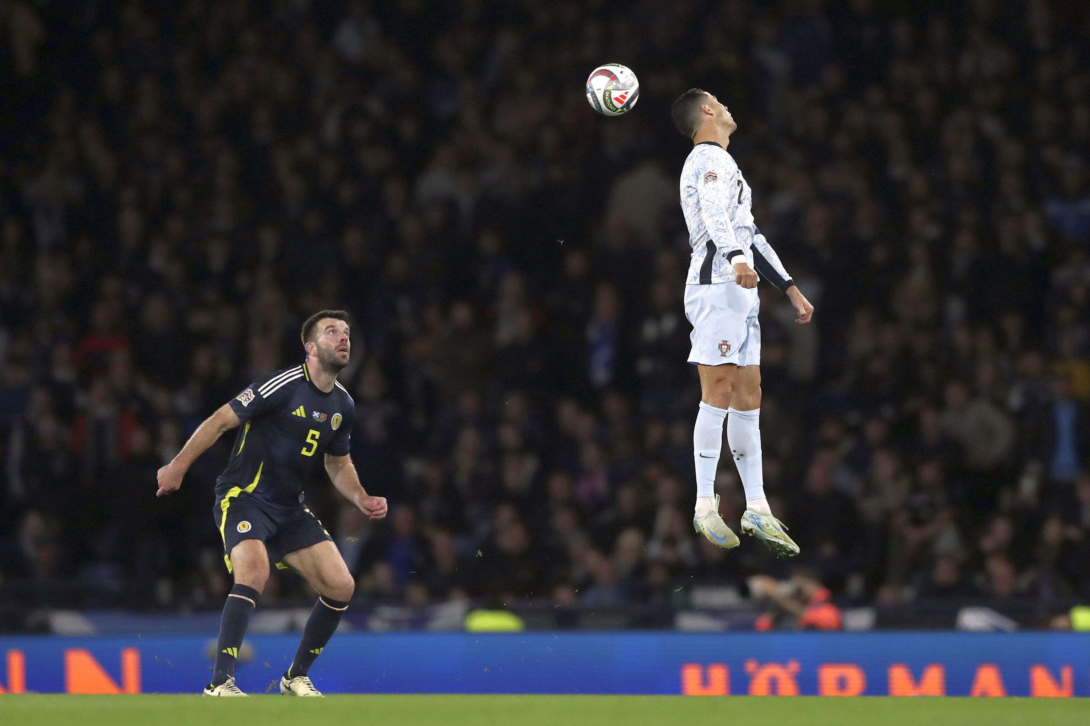 Portugal's Cristiano Ronaldo, right, heads the ball ahead of Scotland's Grant Hanley during the UEFA Nations League soccer match between Scotland and Portugal at Hampden Park in Glasgow, Scotland, Tuesday, October 15, 2024. (Photo by Scott Heppell/AP Photo)