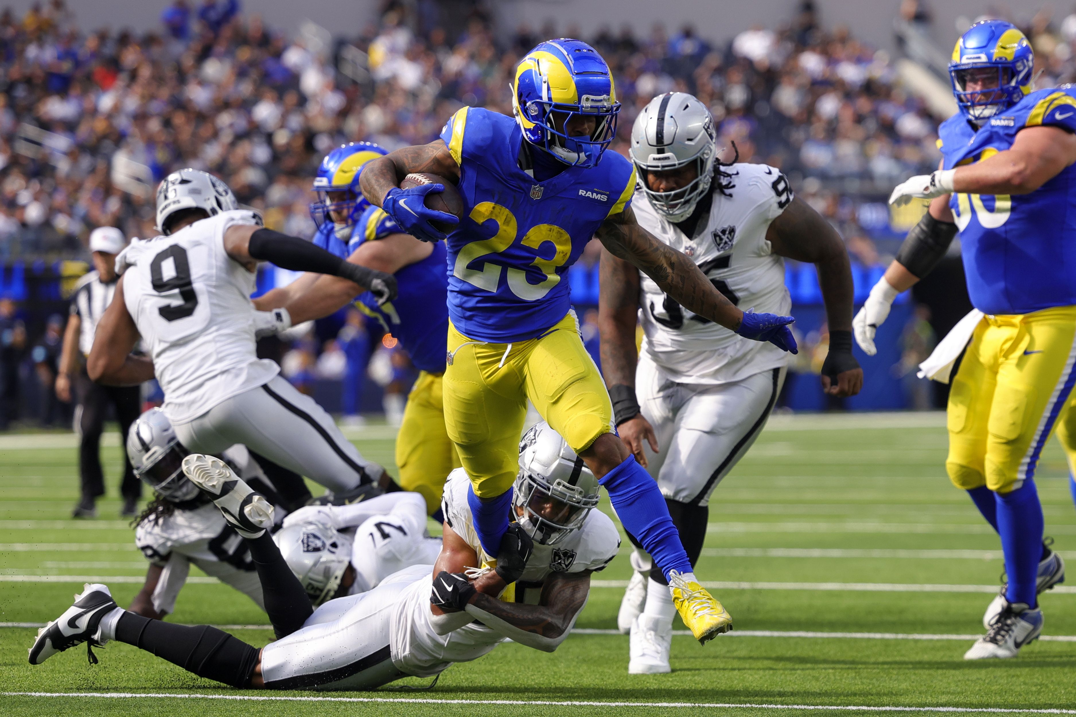 Los Angeles Rams running back Kyren Williams (23) runs for a touchdown as Las Vegas Raiders safety Isaiah Pola-Mao, bottom, attempts to tackle during the first half of an NFL football game against the Las Vegas Raiders, Sunday, October 20, 2024, in Inglewood, Calif. (Photo by Ryan Sun/AP Photo)