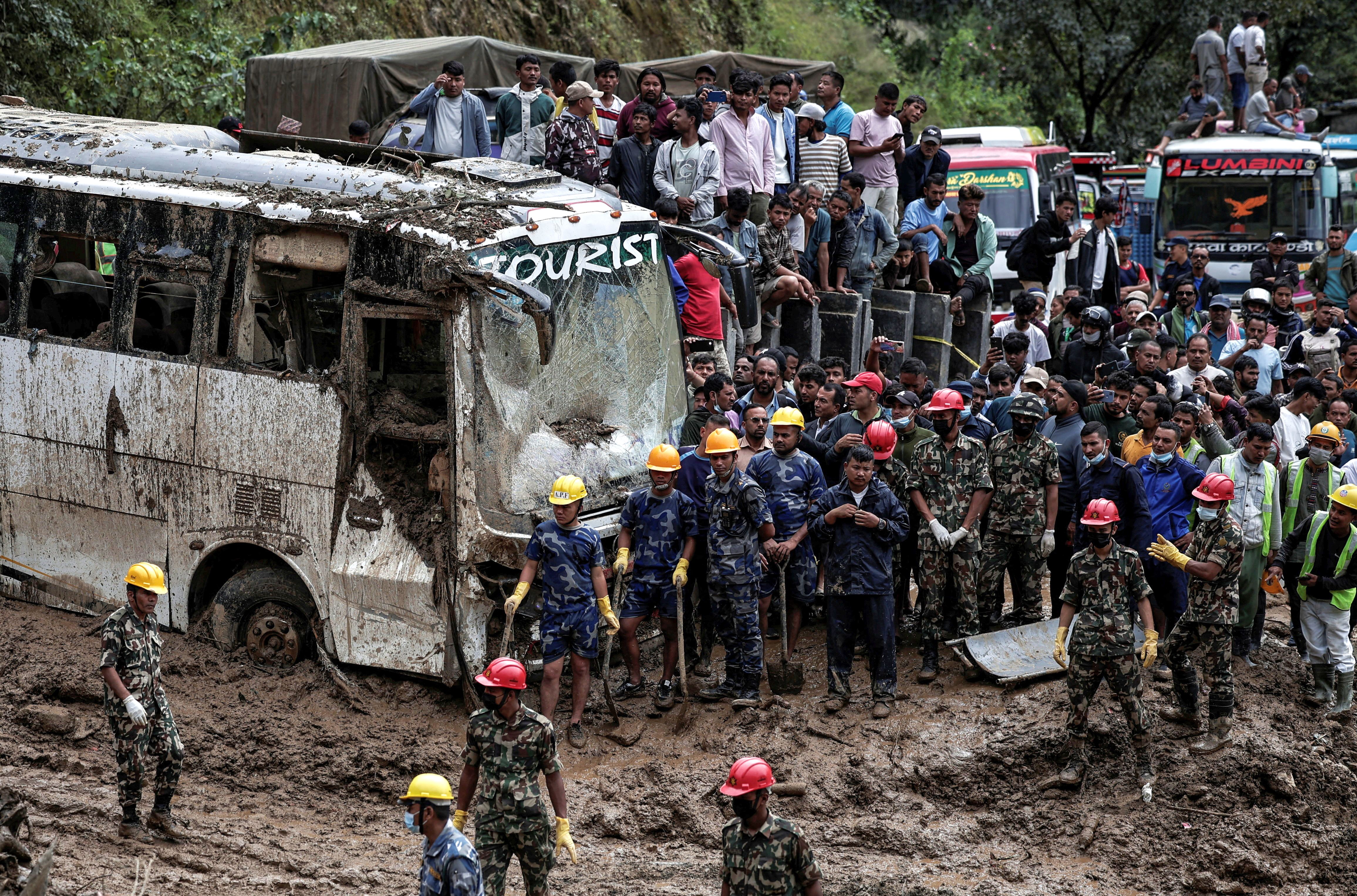 People stranded at the Tribhuwan Highway look on as rescue personnel work to retrieve the bodies of the victims from a landslide triggered by heavy rainfall in Dhading, Nepal, on September 29, 2024. (Photo by Navesh Chitrakar/Reuters)