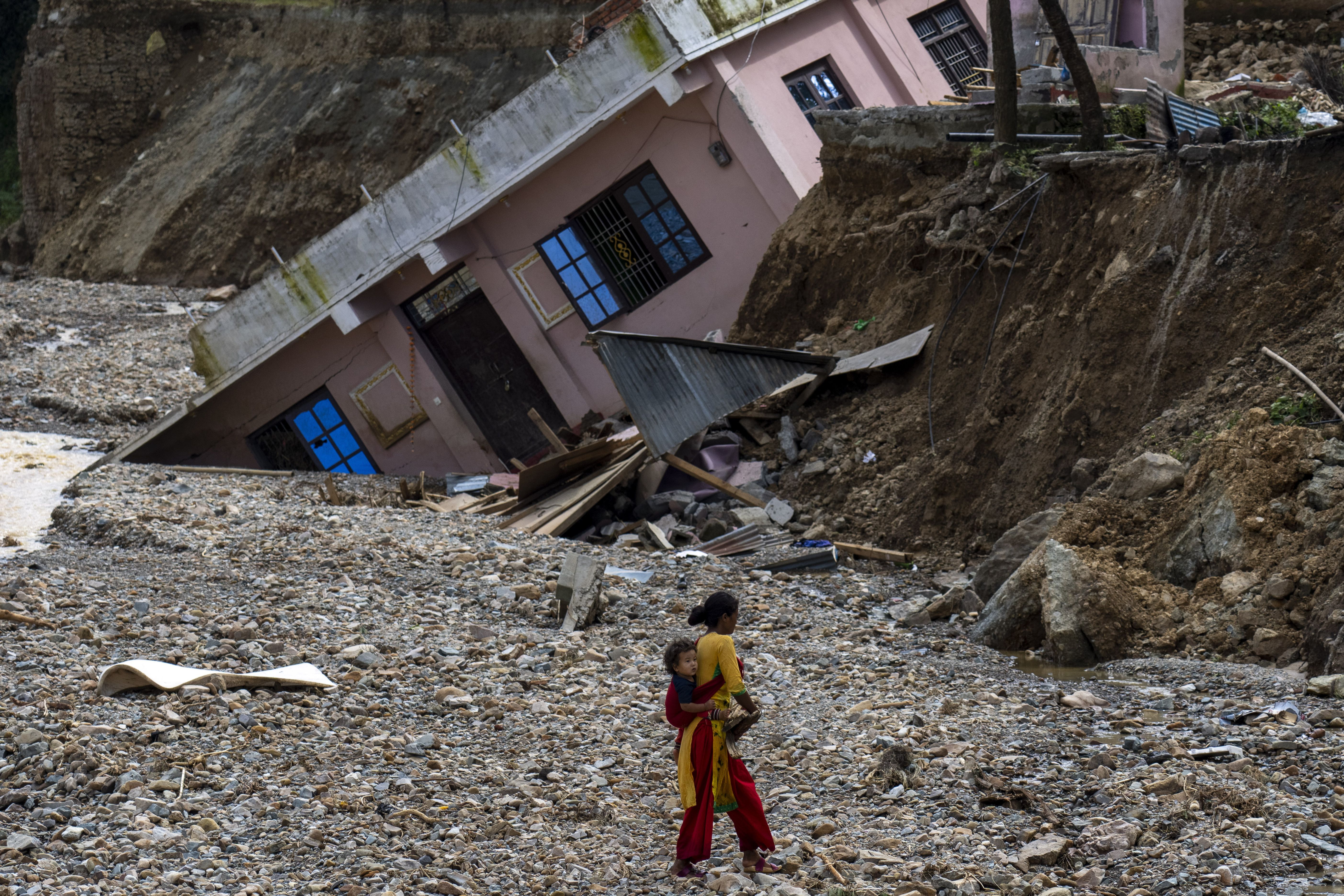 A woman with a child on her back walks past a house which had collapsed due to flooding in the Nakhu river caused by heavy rains in Lalitpur, Nepal, on Tuesday, October 1, 2024. (Photo by Niranjan Shrestha/AP Photo)