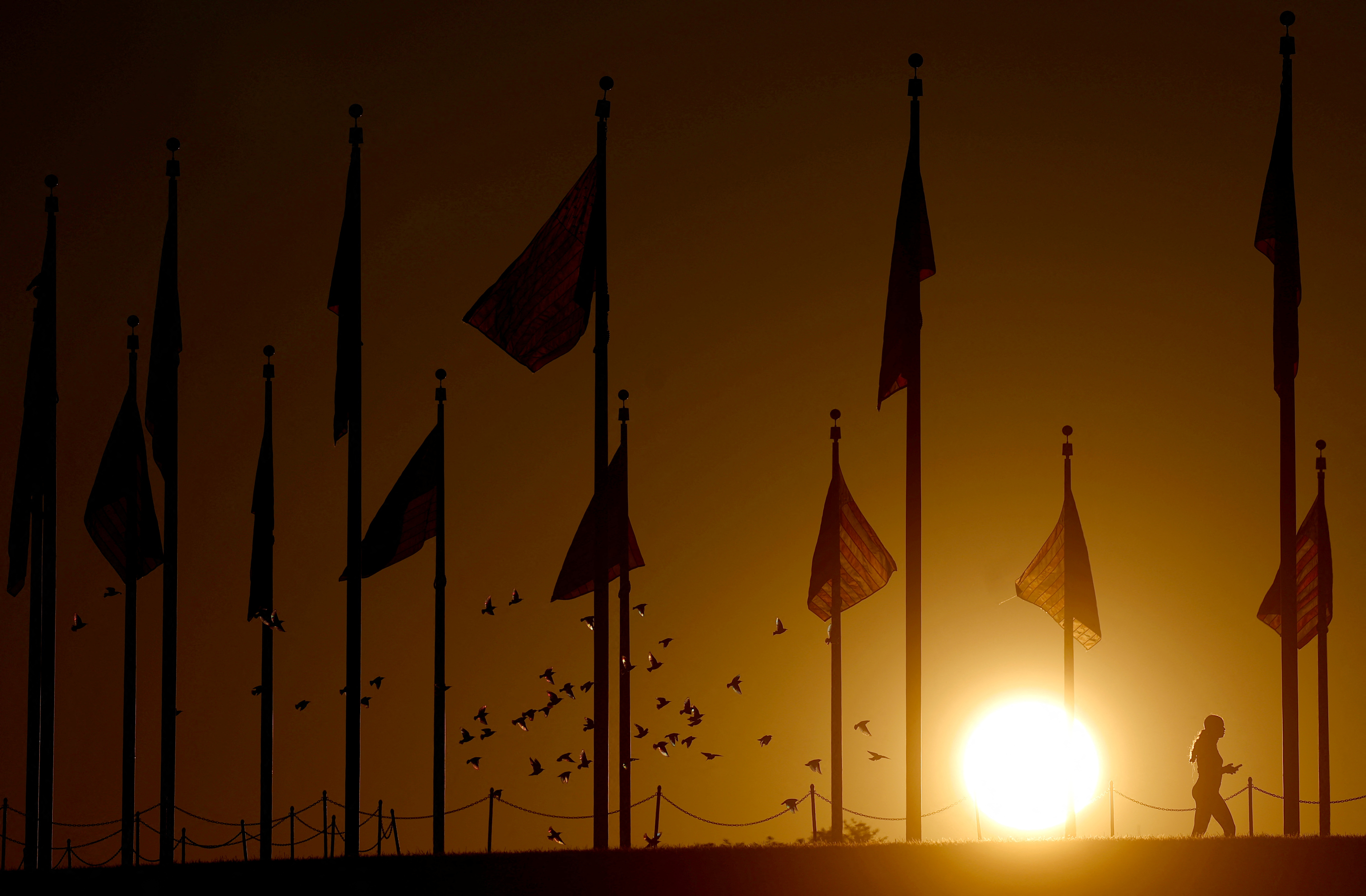 A woman walks during sunrise at the National Mall in Washington, US, on October 21, 2024. (Photo by Hannah McKay/Reuters)