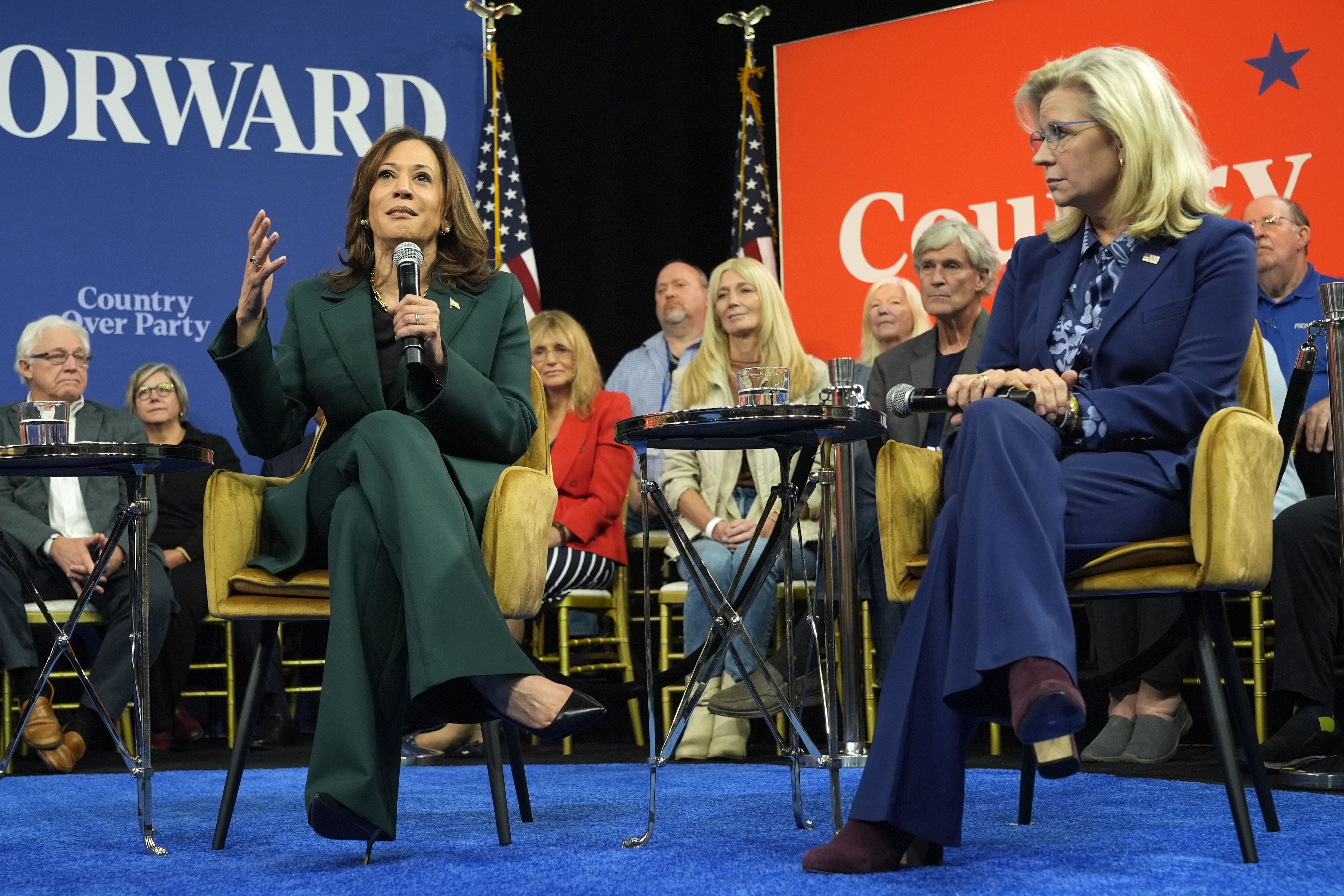 Democratic presidential nominee Vice President Kamala Harris speaks as former Republican Congresswoman Liz Cheney listens during a town hall at The People's Light in Malvern, Pa., Monday, October 21, 2024. (Photo by /AP Photo)