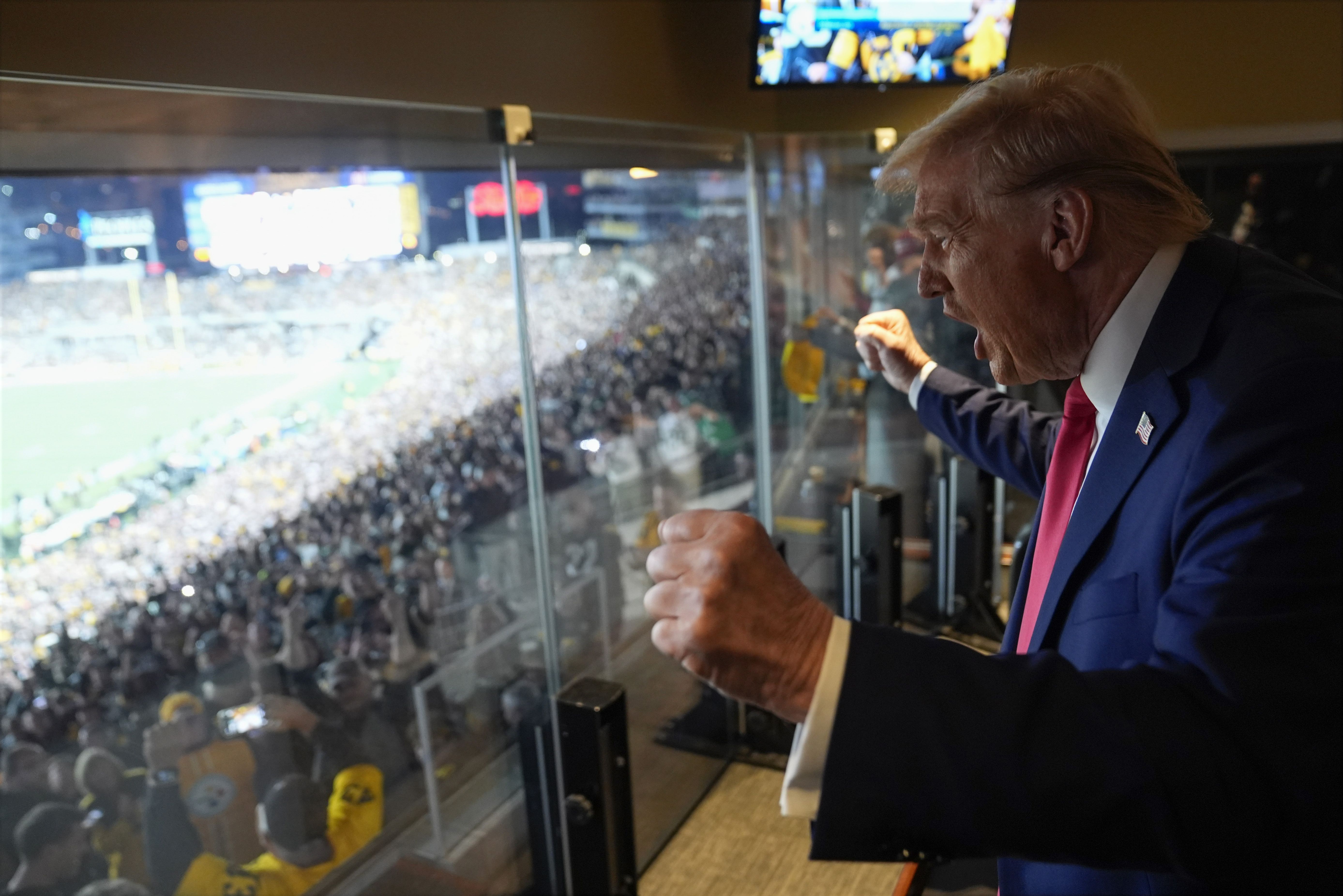Republican presidential nominee former President Donald Trump attends the New York Jets football game against the Pittsburgh Steelers at Acrisure Stadium, Sunday, October 20, 2024, in Pittsburgh. (Photo by Evan Vucci/Pool via AP Photo)