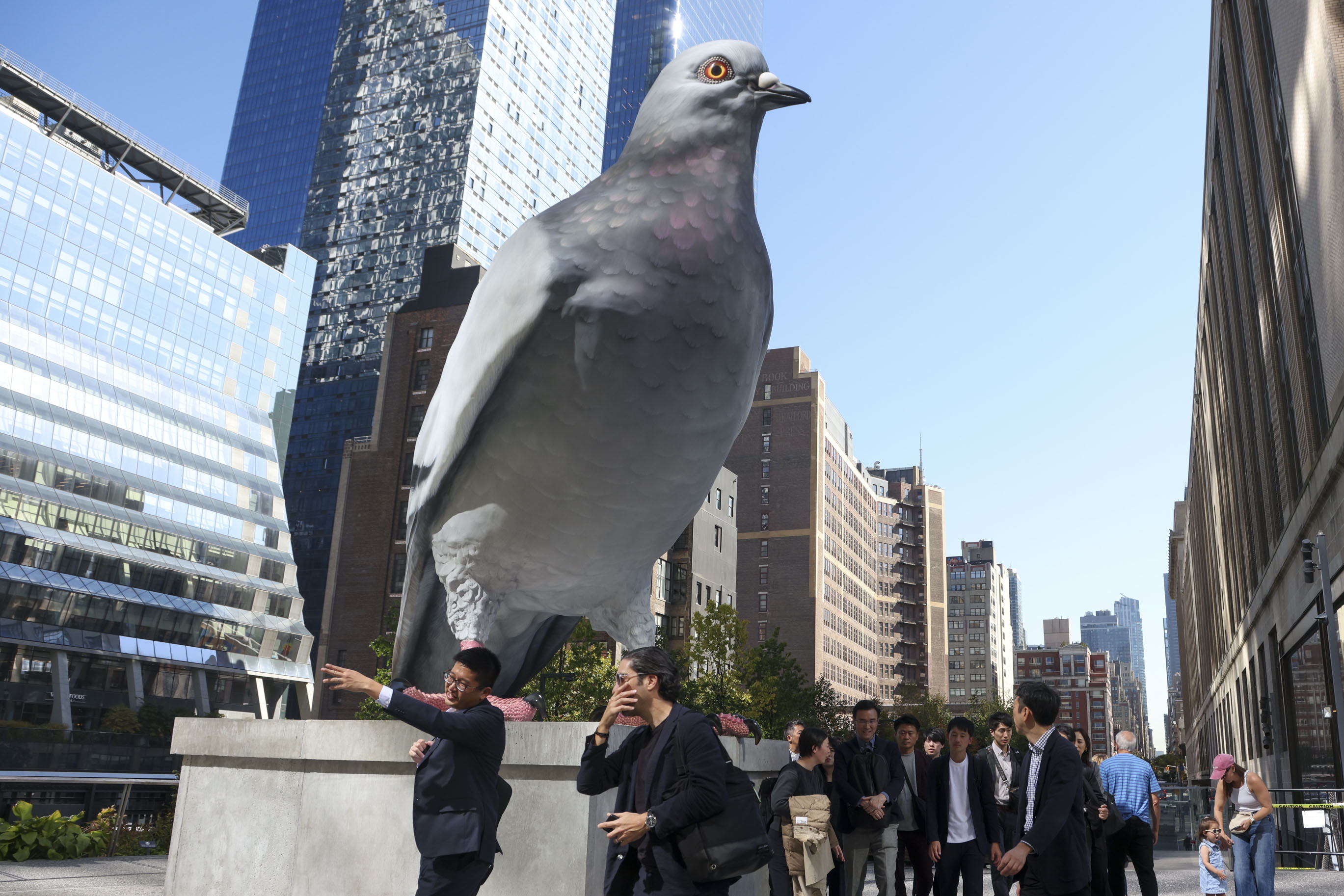 People walk past “Dinosaur”, a hyper-realistic sculpture of a pigeon cast in aluminum created by Colombian-French artist Ivan Argote, displayed at the High Line Plinth in New York, USA, 21 October 2024. The sculpture will be on display for 18 months on the High Line Plinth, as part of a display of artworks in the heart of the city that began in 2019. (Photo by Sarah Yenesel/EPA)