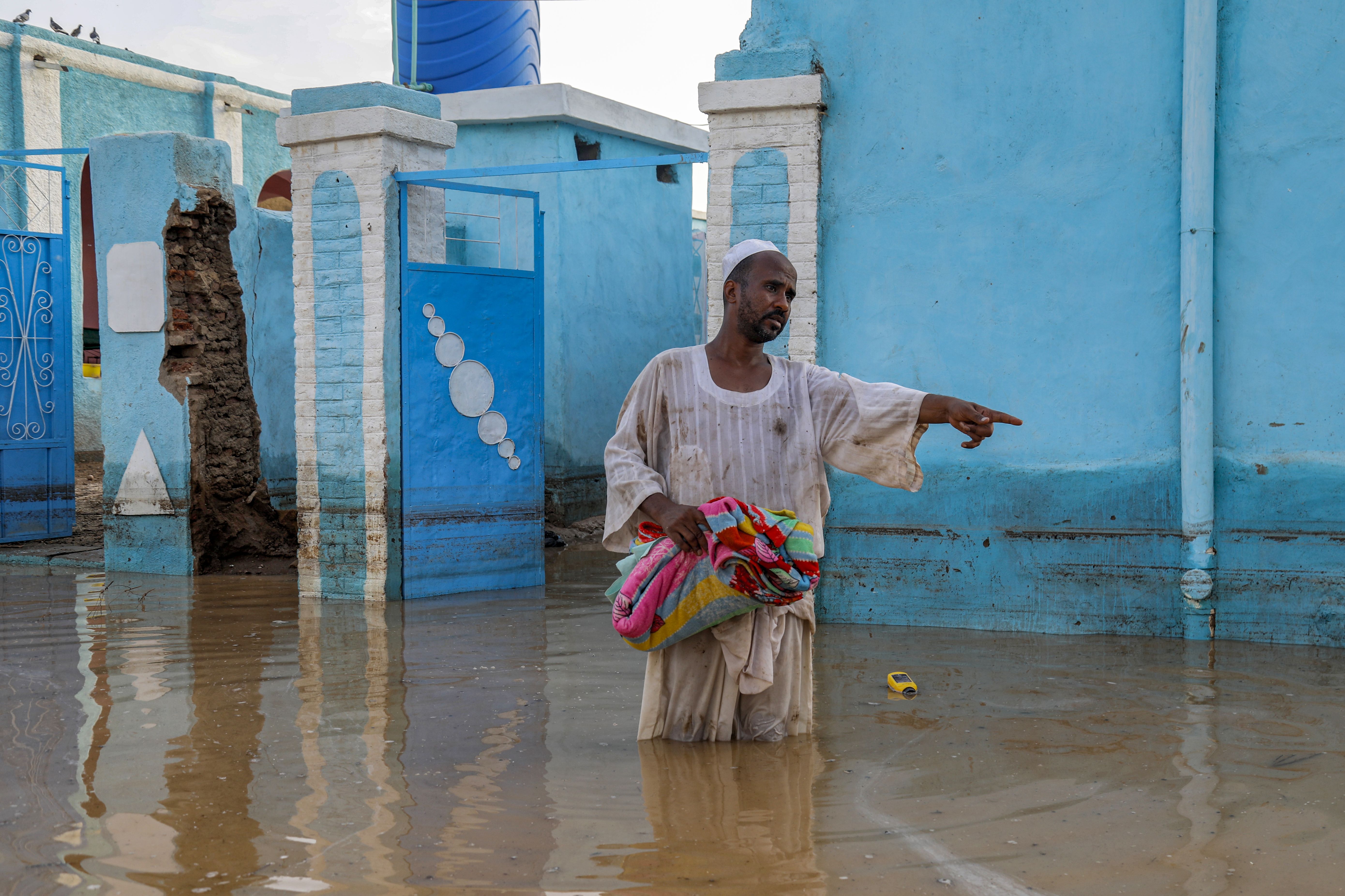 A holds salvaged items as he stands in a flooded area in al-Sagai north of Omdurman on August 6, 2023. Torrential rains have destroyed more than 450 homes in Sudan's north, state media reported on August 7, validating concerns voiced by aid groups that the wet season would compound the war-torn country's woes. Changing weather patterns saw Sudan's Northern State buffeted with heavy rain, causing damage to at least 464 houses, state-run SUNA news agency said. (Photo by AFP Photo/Stringer)