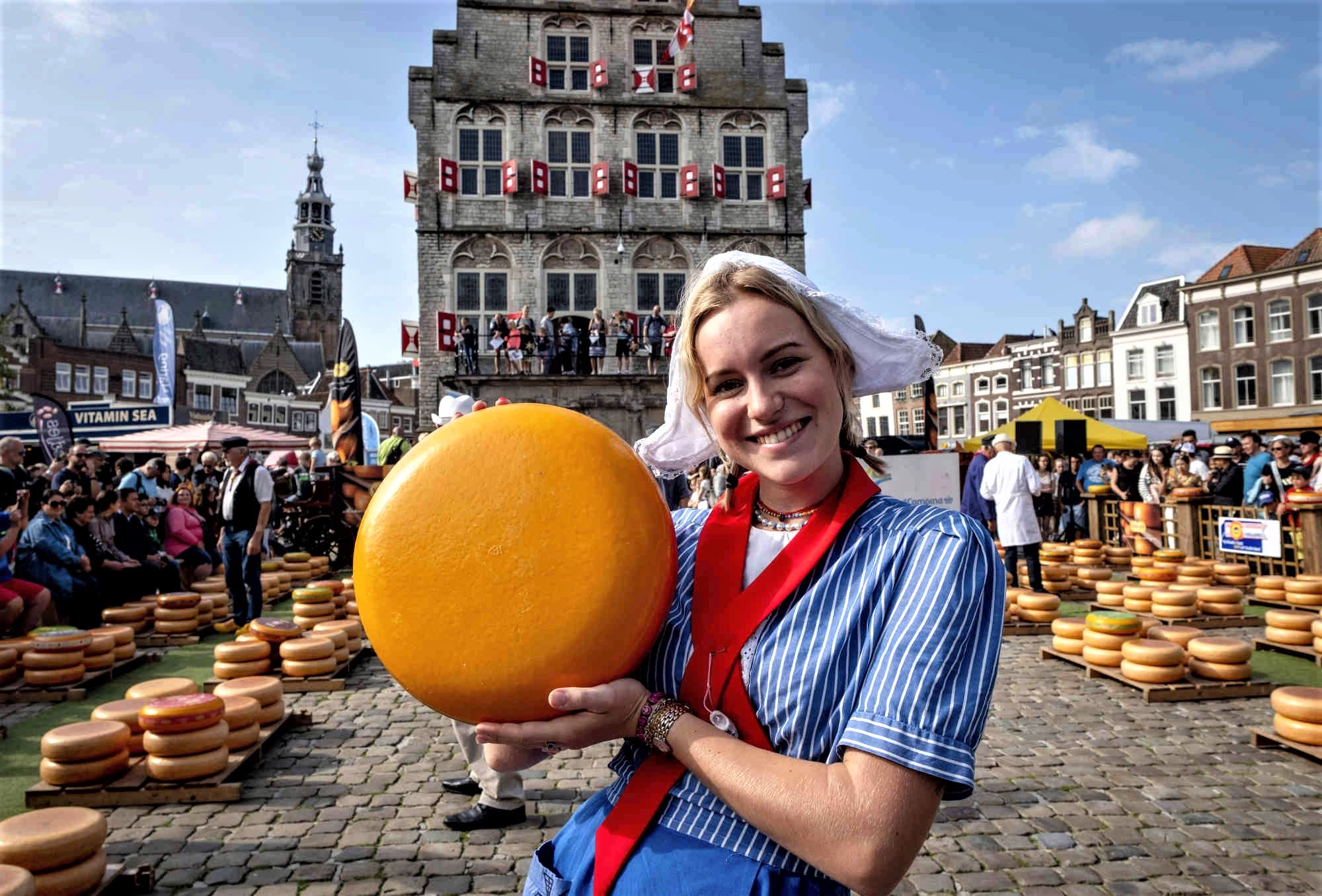A young woman wears a traditional dress as she displays a loaf of Gouda cheese at the cheese market in Gouda, Netherlands, Thursday, August 17, 2023. The cheese market takes place very Thursday and has a 900-year-old tradition. (Photo by Michael Probst/AP Photo)