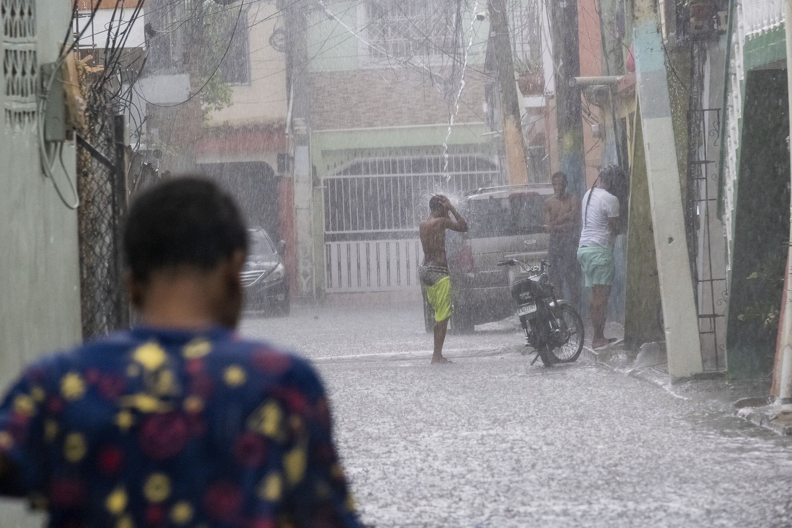 A man stands under a roof drain as the rain of Tropical Storm Franklin fall on Santo Domingo, Dominican Republic, Tuesday, August 22, 2023. (Photo by Ricardo Hernandez/AP Photo)