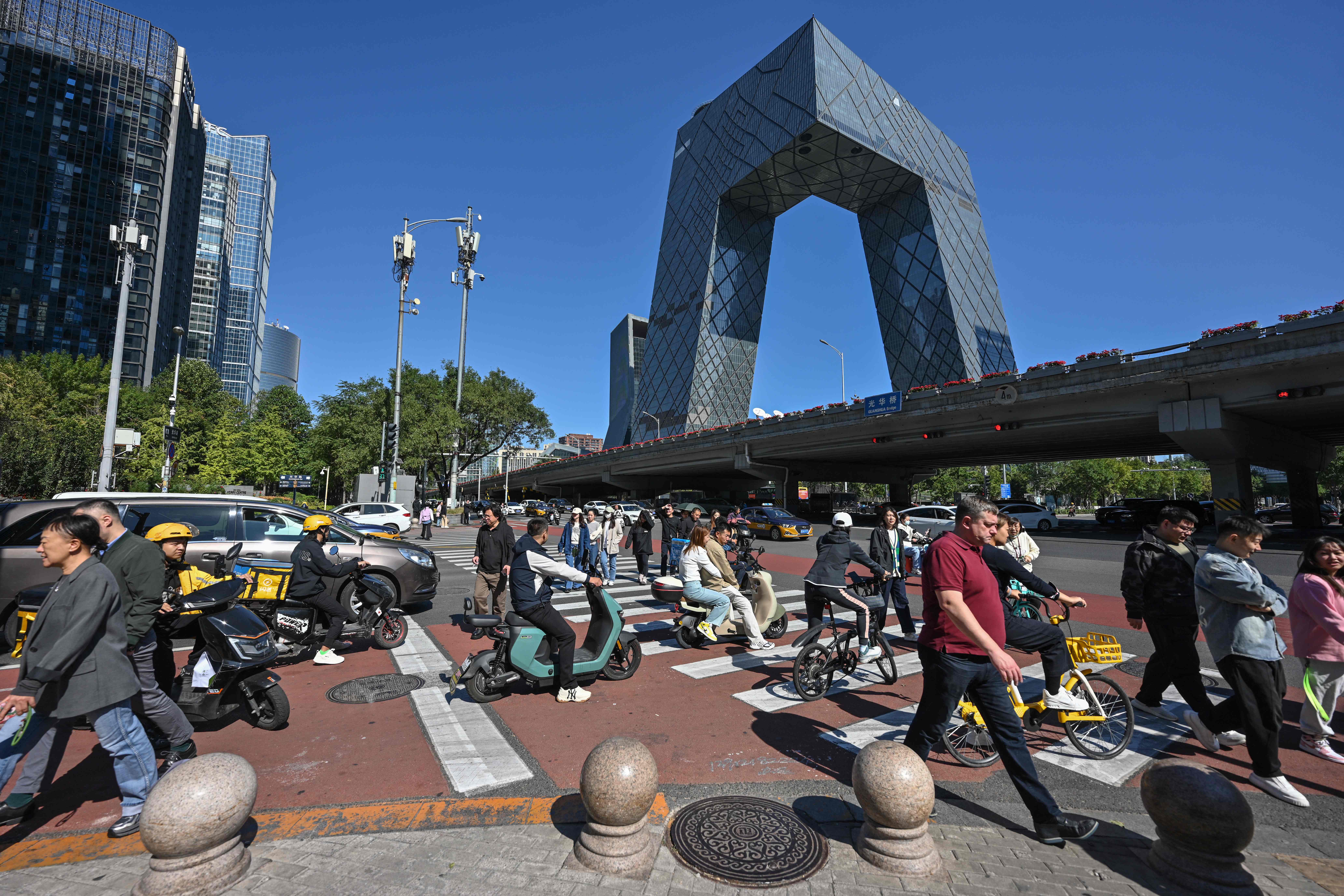 People cross a road in the business district in Beijing on October 8, 2024. (Photo by Adek Berry/AFP Photo)