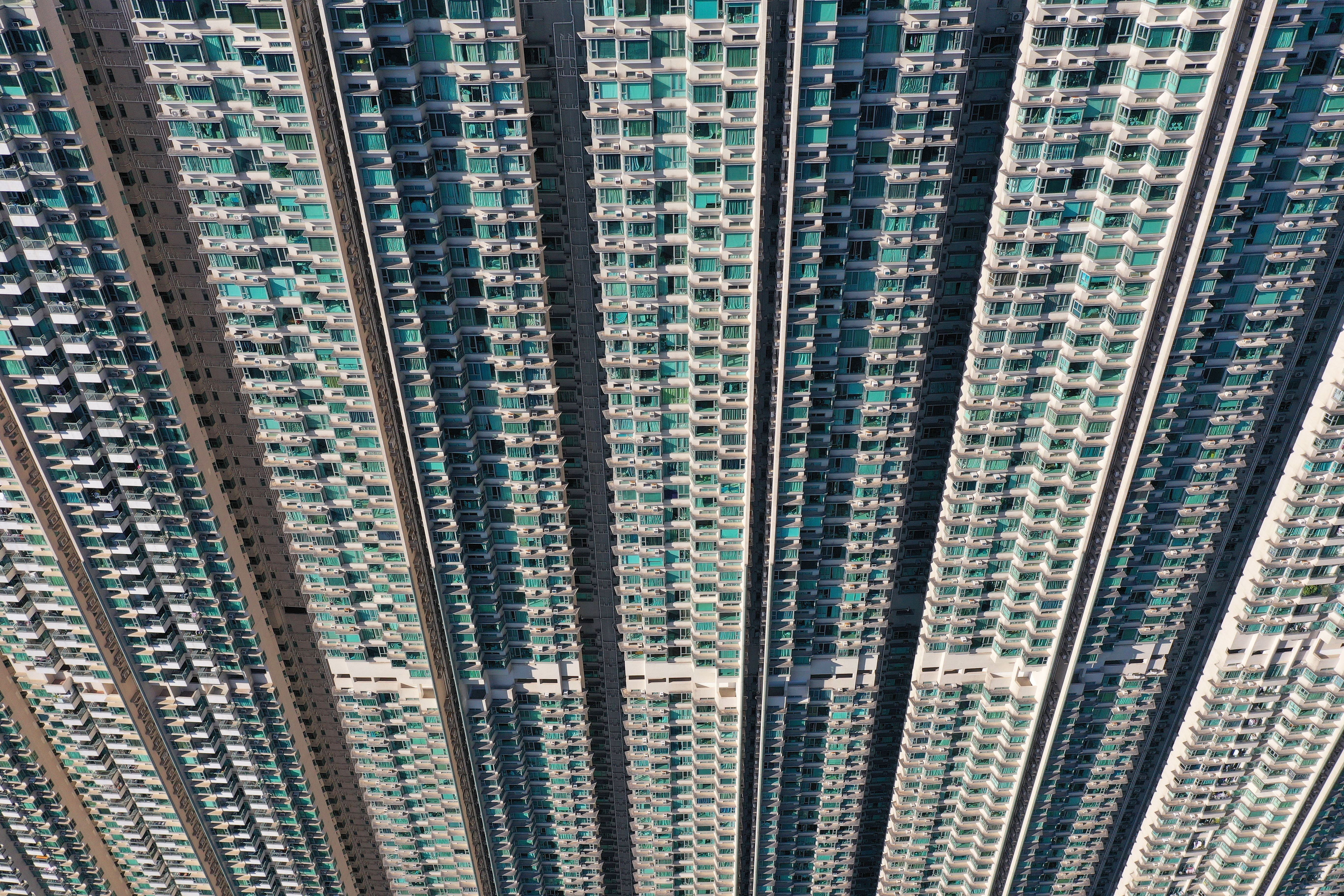 This aerial photo taken on October 14, 2024 shows apartment blocks in Tung Chung on Lantau Island in Hong Kong. (Photo by Peter Parks/AFP Photo)