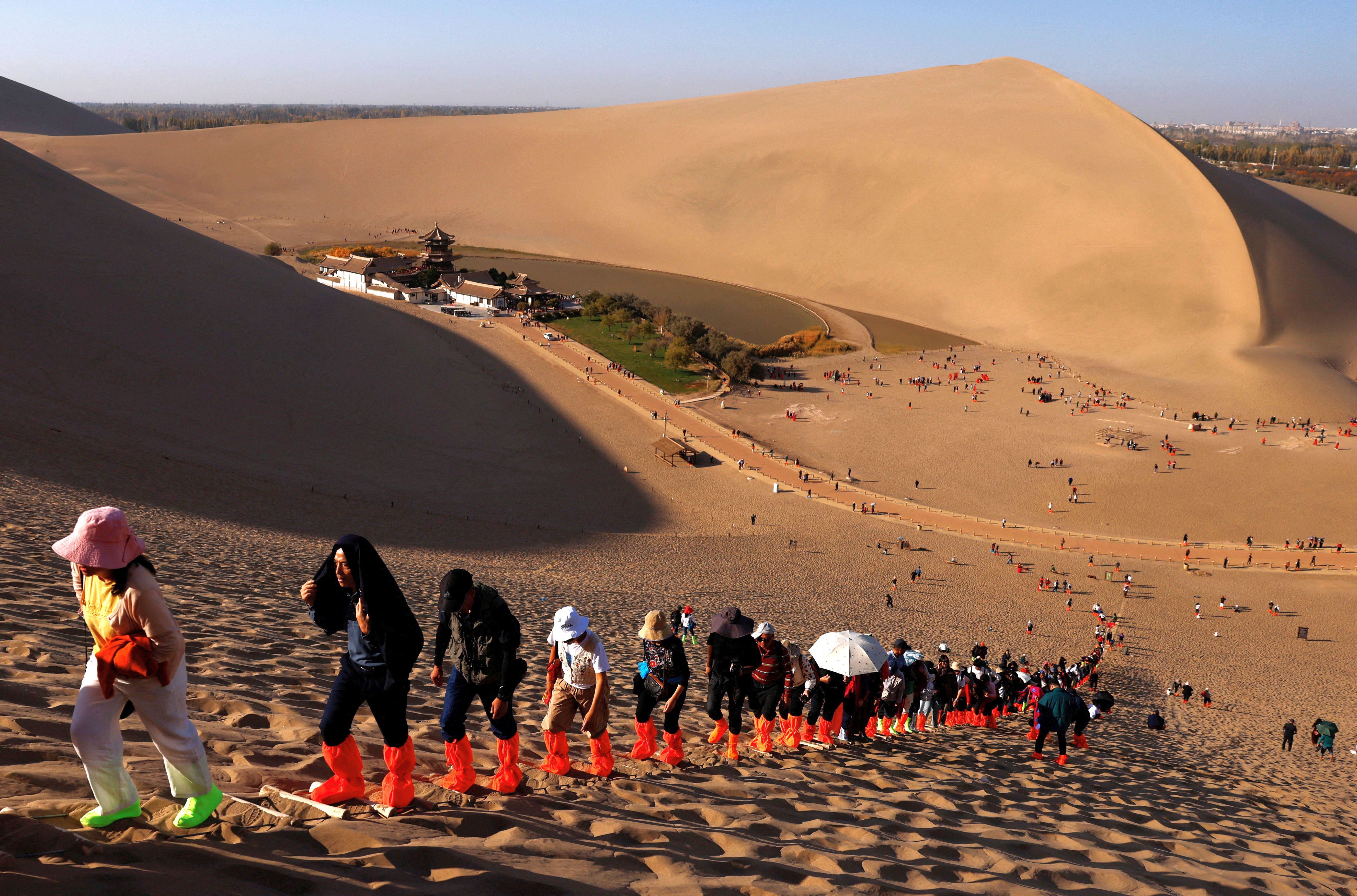 Tourists wearing shoe protectors climb up a dune with the overlook view of Crescent Spring at Mingsha Mountain, during an organised media tour to Dunhuang, in Gansu province, China on October 15, 2024. (Photo by Tingshu Wang/Reuters)