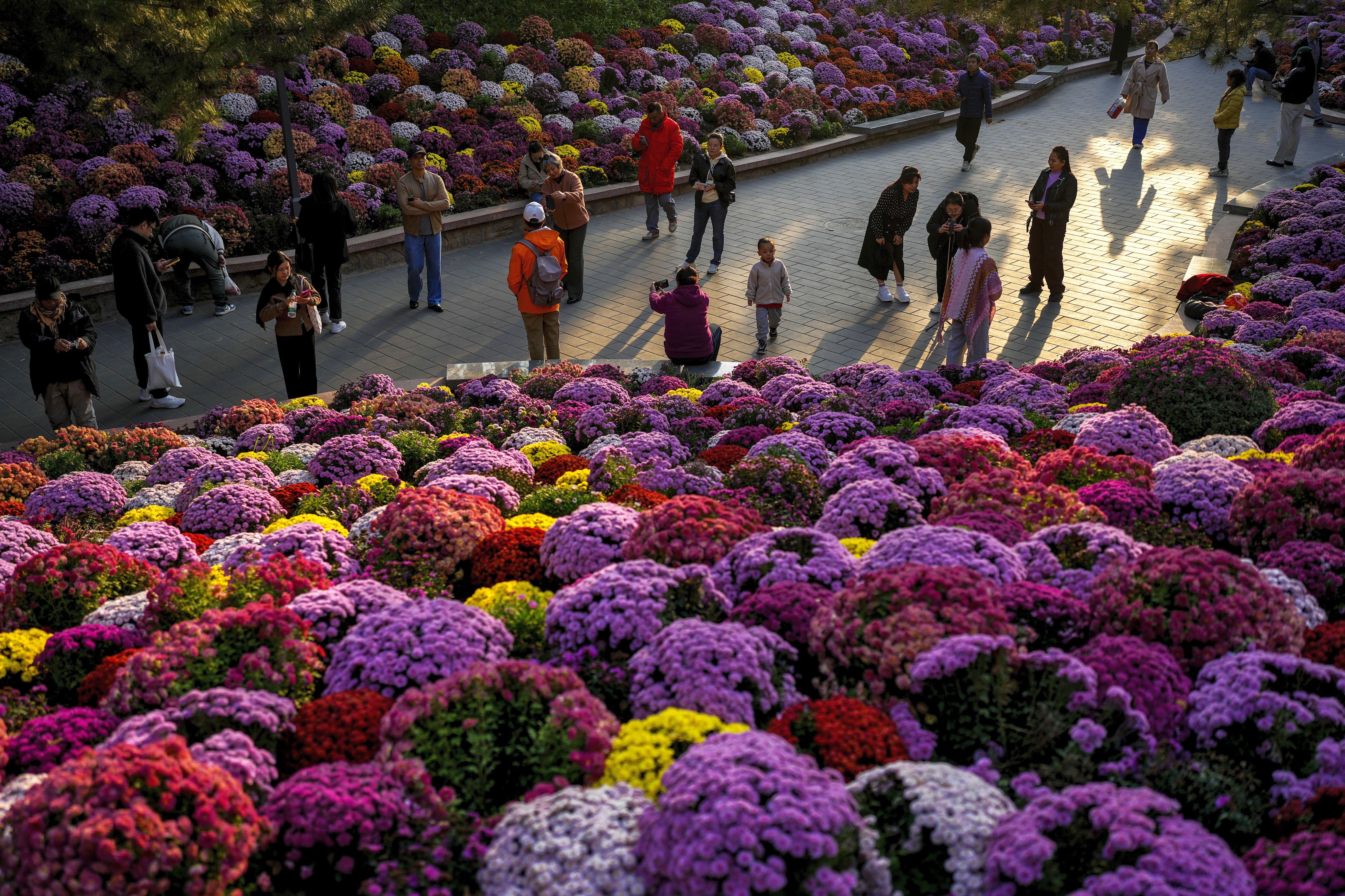 Residents gather near flower blossoms as they take an evening walk at a public park in Beijing, Monday, October 21, 2024. (Photo by Andy Wong/AP Photo)