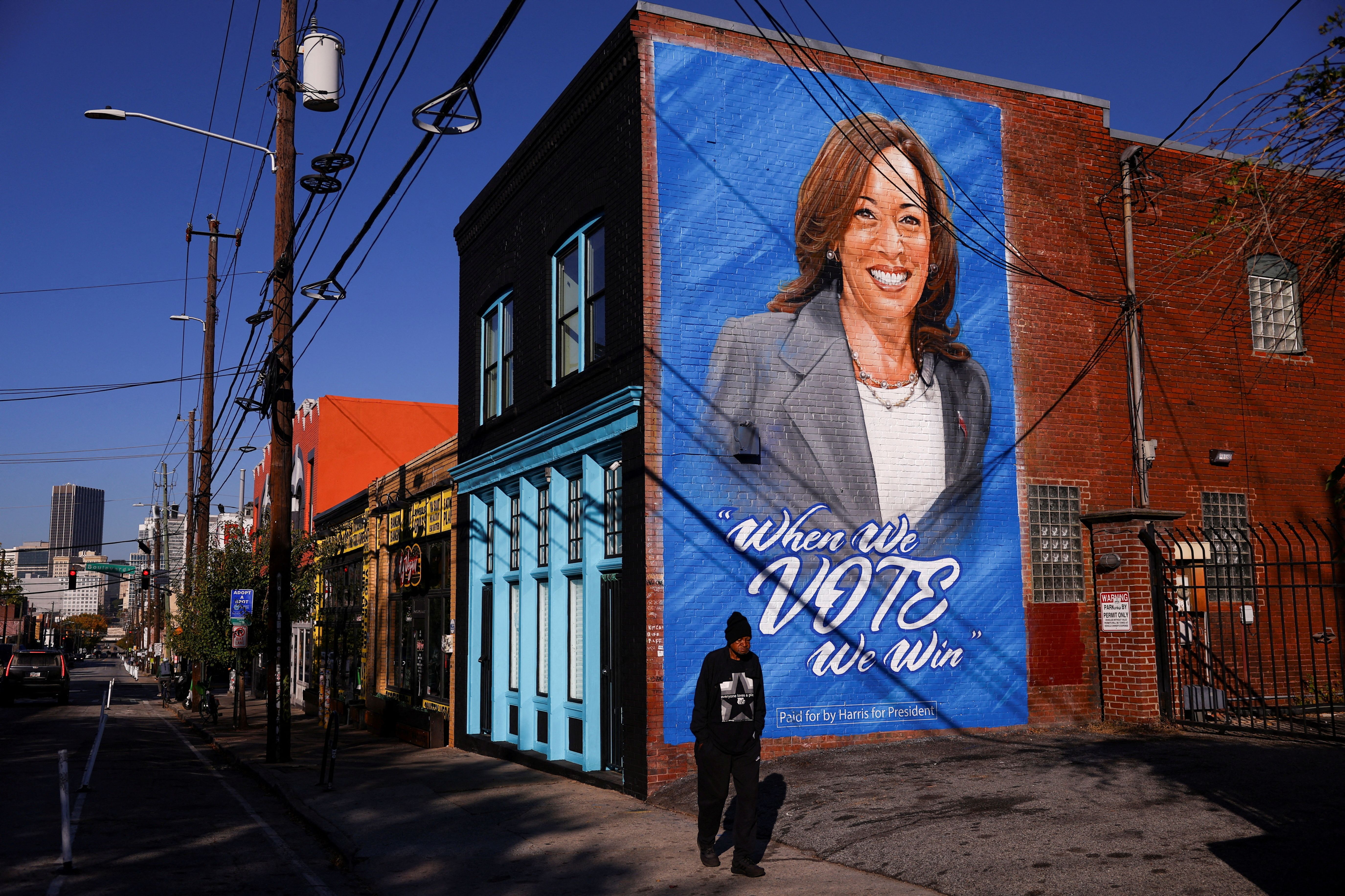 A man walks past a mural in support of Democratic presidential nominee and U.S. Vice President Kamala Harris in Atlanta, Georgia on October 23, 2024. (Photo by Hannah McKay/Reuters)
