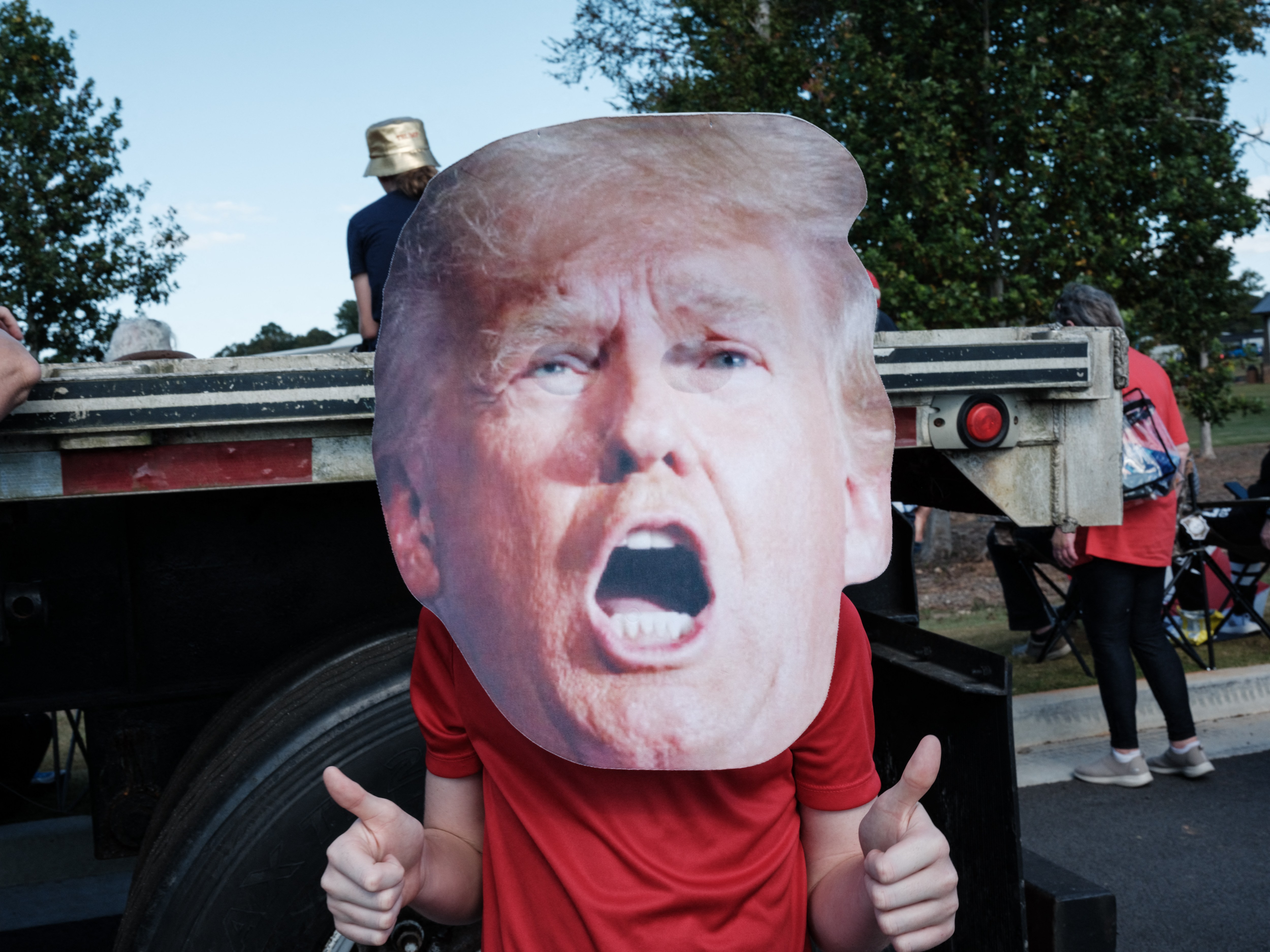 A 11-year-old boy poses with a mask of former US President and Republican presidential candidate Donald Trump that was purchased at a Halloween store before a campaign rally outside Christ Chapel in Zebulon, Georgia, on October 23, 2024. (Photo by Yasuyoshi Chiba/AFP Photo)
