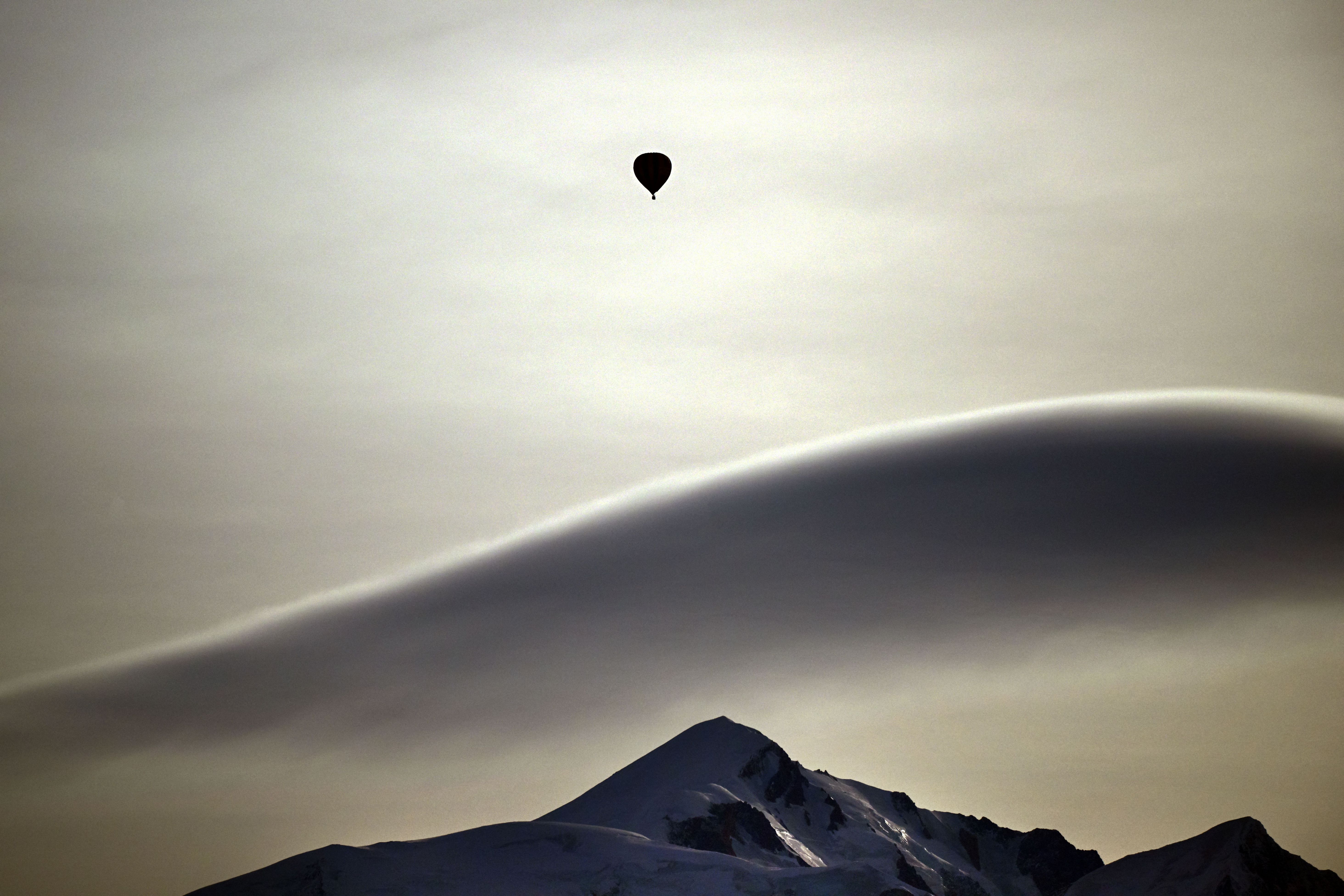 This photograph taken from Cordon ski resort near Megeve on February 18, 2024 near Cordon ski resort near Megeve, shows a hot air balloon drifing over the Massif du Mont-Blanc mountains range in the French Alps in France. (Photo by Olivier Chassignole/AFP Photo)
