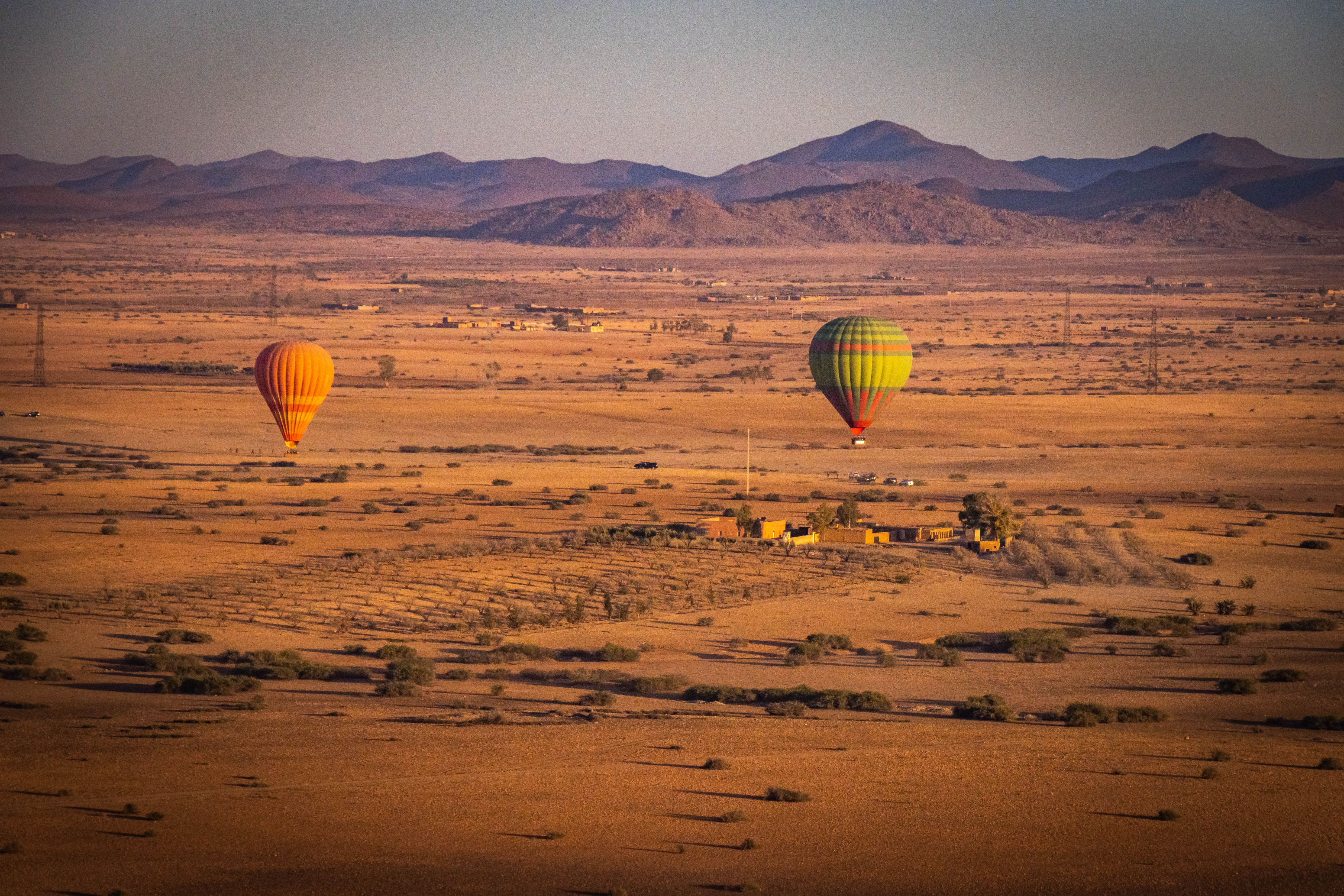Flight with hot air balloon over Marrakech at sunrise, aerial view of desert and High Atlas Mountains on March 27, 2024. (Photo by Andrea Aigner/Getty Images)