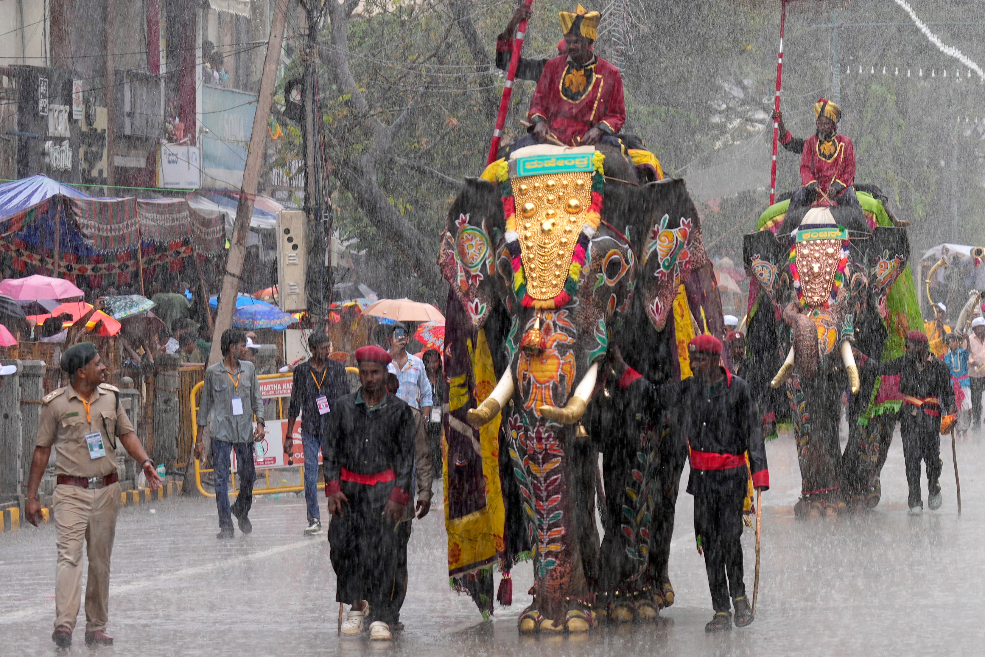 Mahouts ride decorated elephants as it rains during a procession on the last day of the Dussehra festivities, in Mysuru, India, Saturday, October 12, 2024. (Photo by Aijaz Rahi/AP Photo)