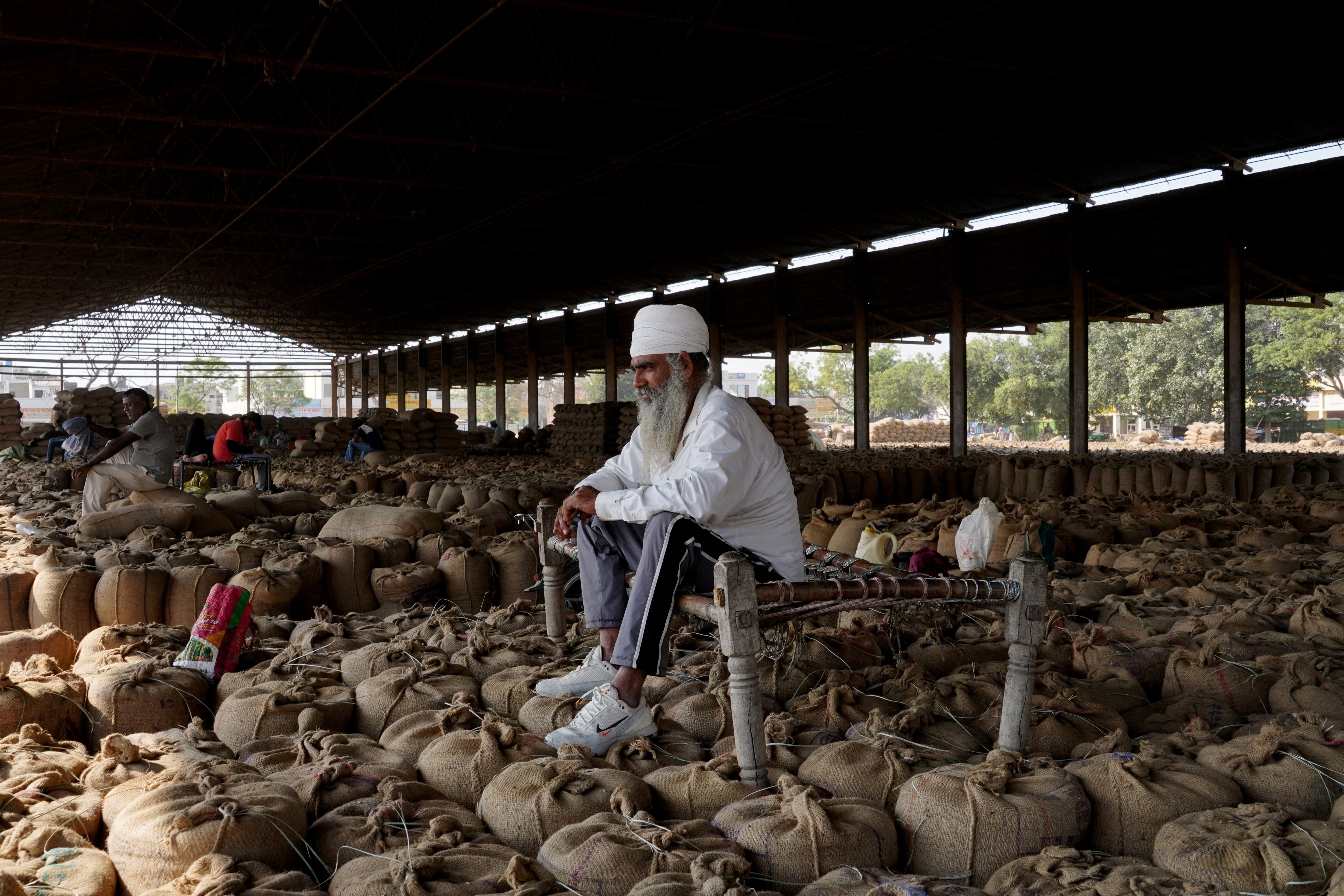 A farmer sits on a cot placed on sacks of rice crops as he waits to sell his crop in a grain market in Karnal in the northern state of Haryana, India, on October 15, 2024. (Photo by Bhawika Chhabra/Reuters)