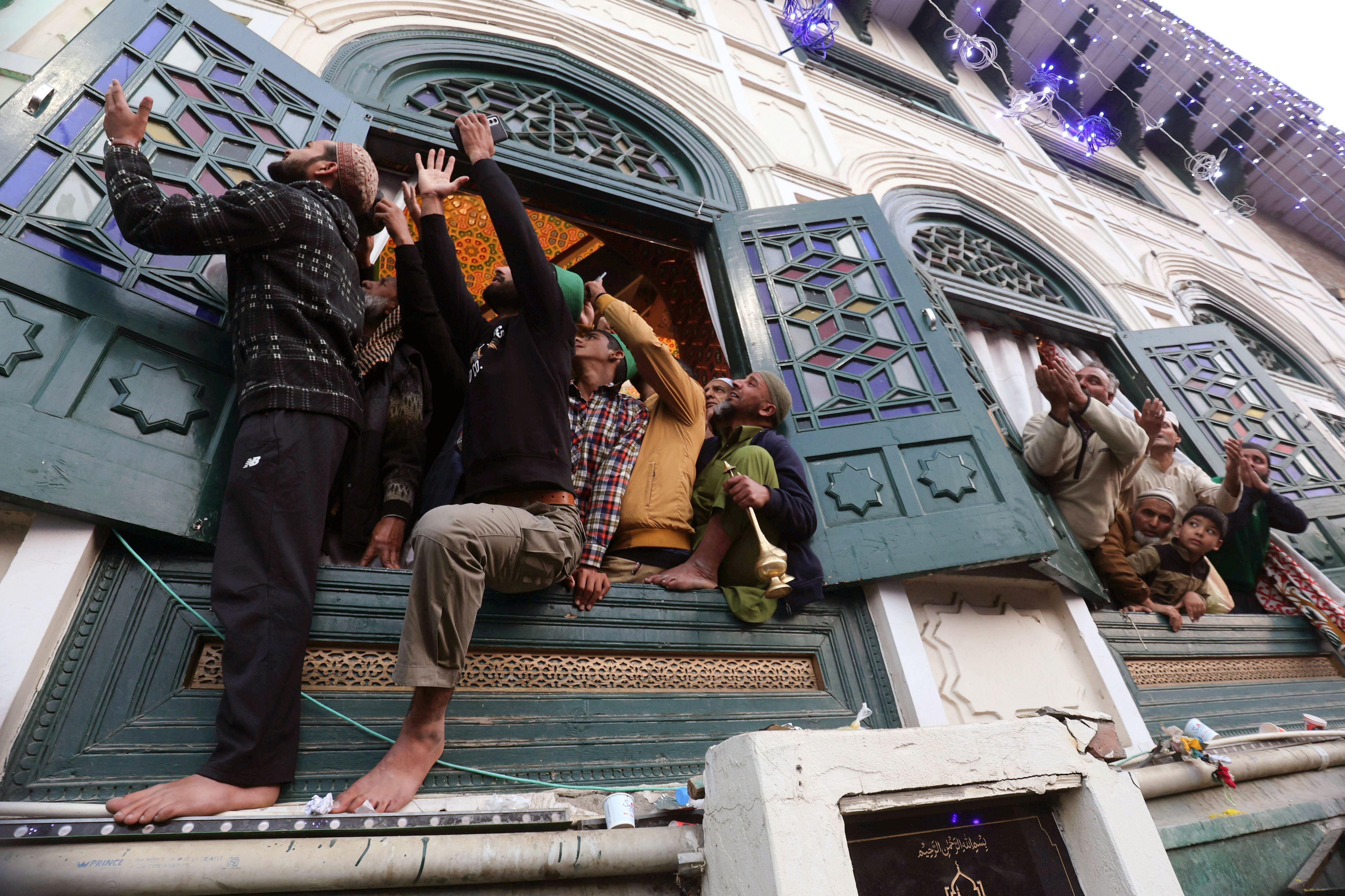 Muslim devotees pray as a priest displays a relic of Sheikh Syed Abdul Qadir Jeelani at his shrine in Srinagar, India, 15 October 2024. Thousands of devotees thronged to the shrine housing the relic as part of an 11-day festival to mark the death anniversary of the 11th and 12th-century Sufi mystic saint Sheikh Syed Abdul Qadir Jilani. (Photo by Farooq Khan/EPA)
