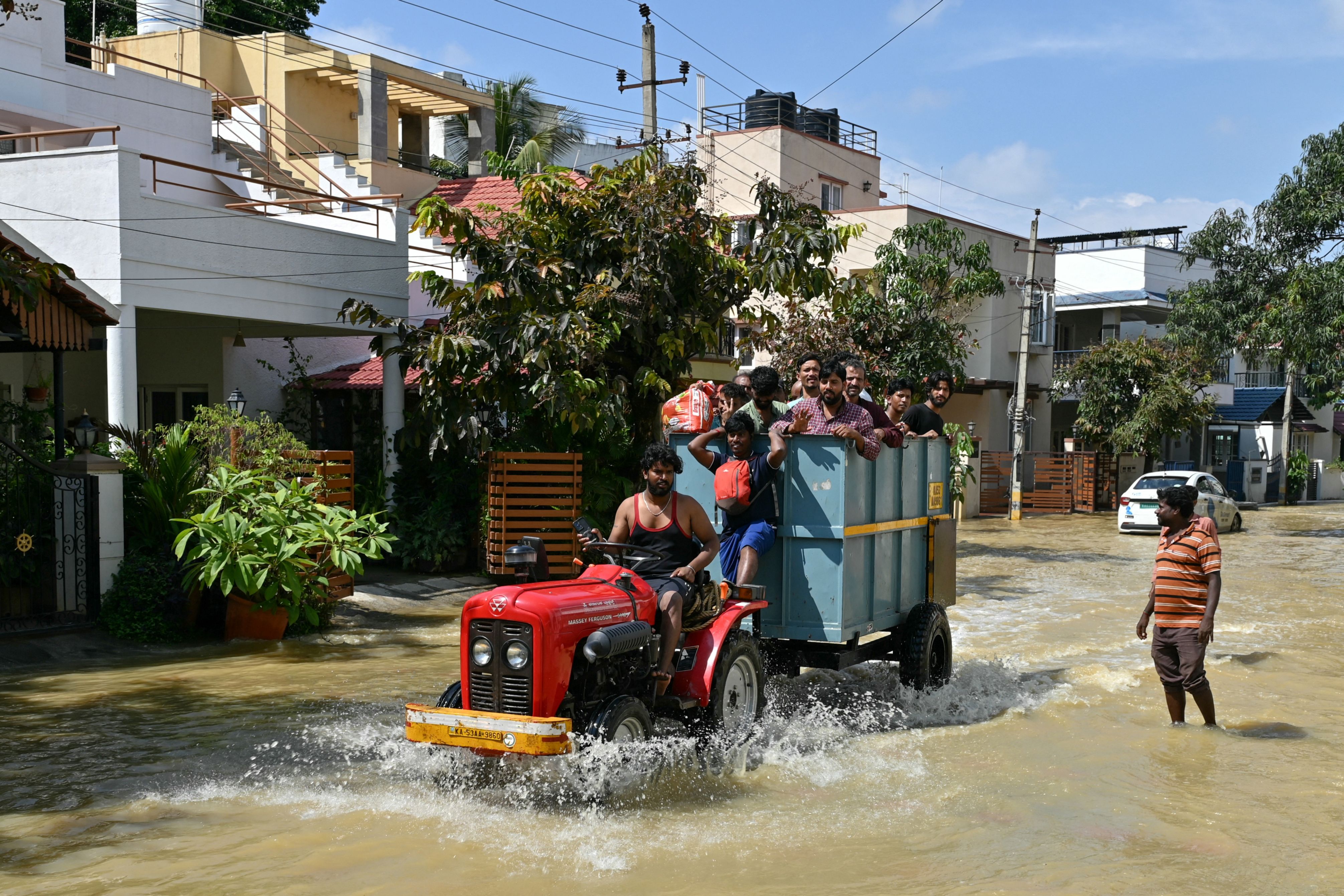 Workers commute through a flooded road following heavy rainfall in Bengaluru on October 21, 2024. (Photo by Idrees Mohammed/AFP Photo)