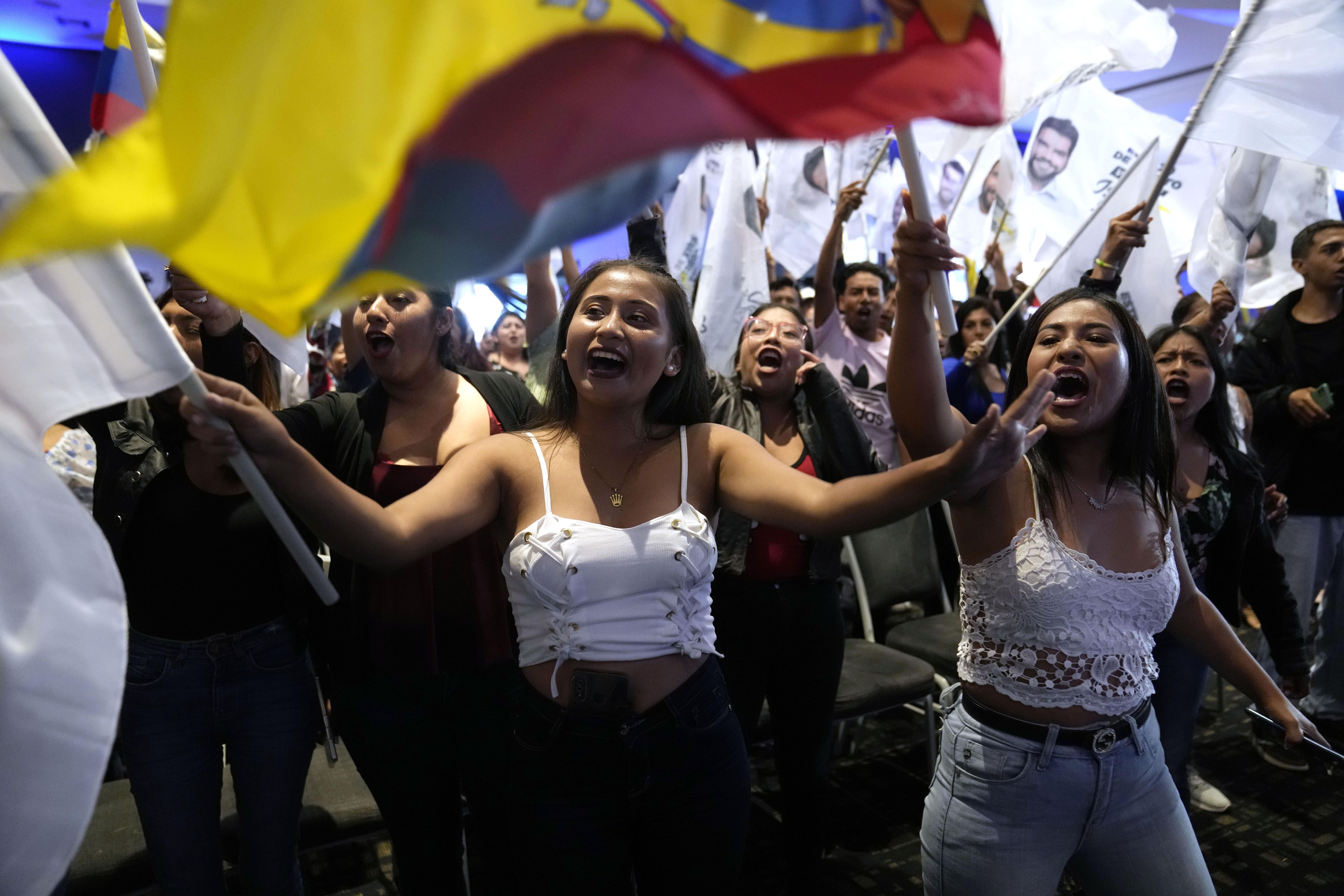Supporters of Jan Topic, presidential candidate for the Country Without Fear Coalition, cheer during a campaign event ahead of snap elections set for Aug. 20, in Guayaquil, Ecuador, Thursday, August 17, 2023. (Photo by Martin Mejia/AP Photo)