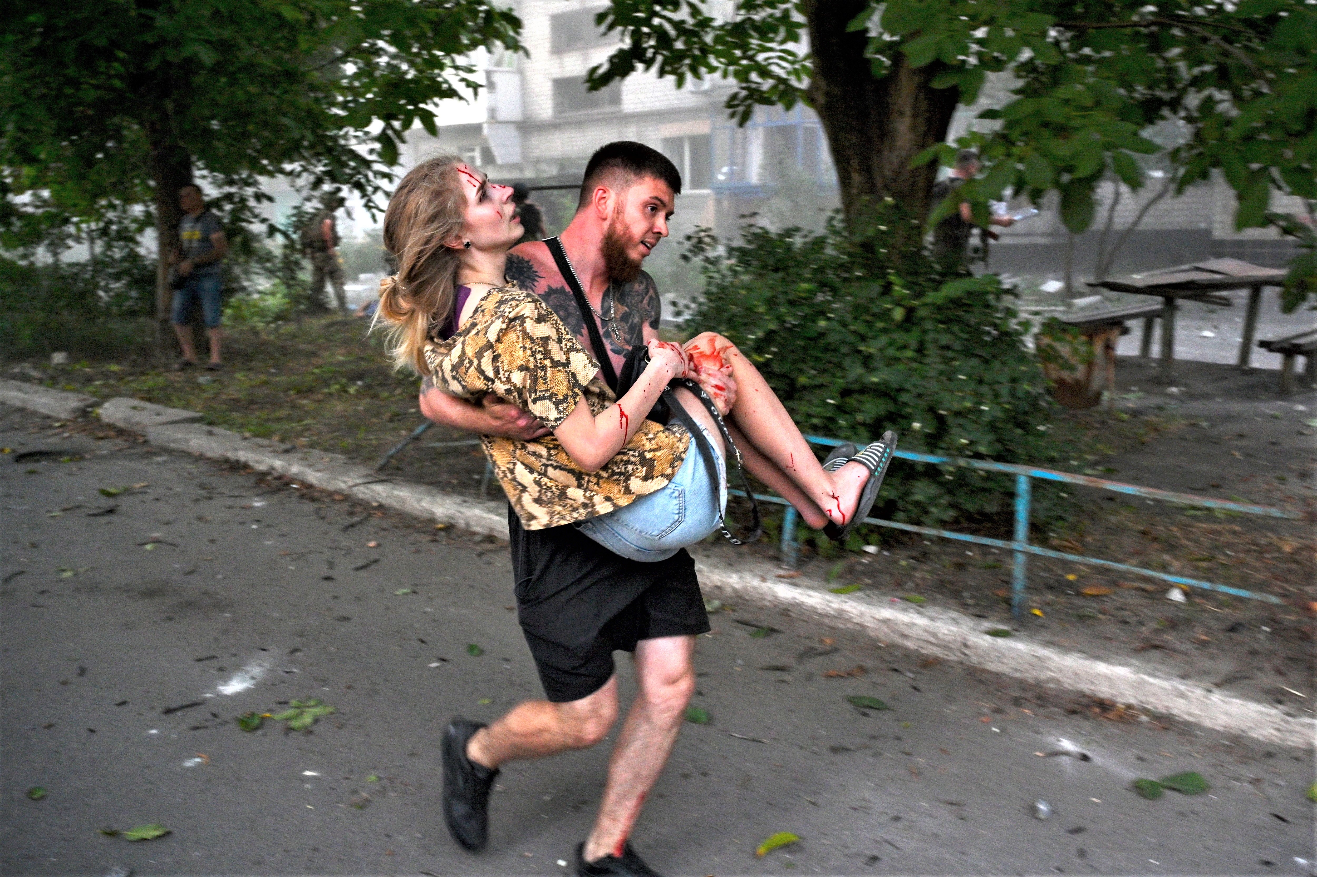 A man carries an injured Ukrainian woman after an explosion of a second rocket in the city of Pokrovsk, Donetsk area, Ukraine, 07 August 2023, amid the Russian invasion. At least five people died and 31 were injured after two rockets hit a residential building and a hotel downtown, according to a National Police report. Russian troops entered Ukrainian territory in February 2022, starting a conflict that has provoked destruction and a humanitarian crisis. (Photo by Stanislav Krupar/EPA/EFE)