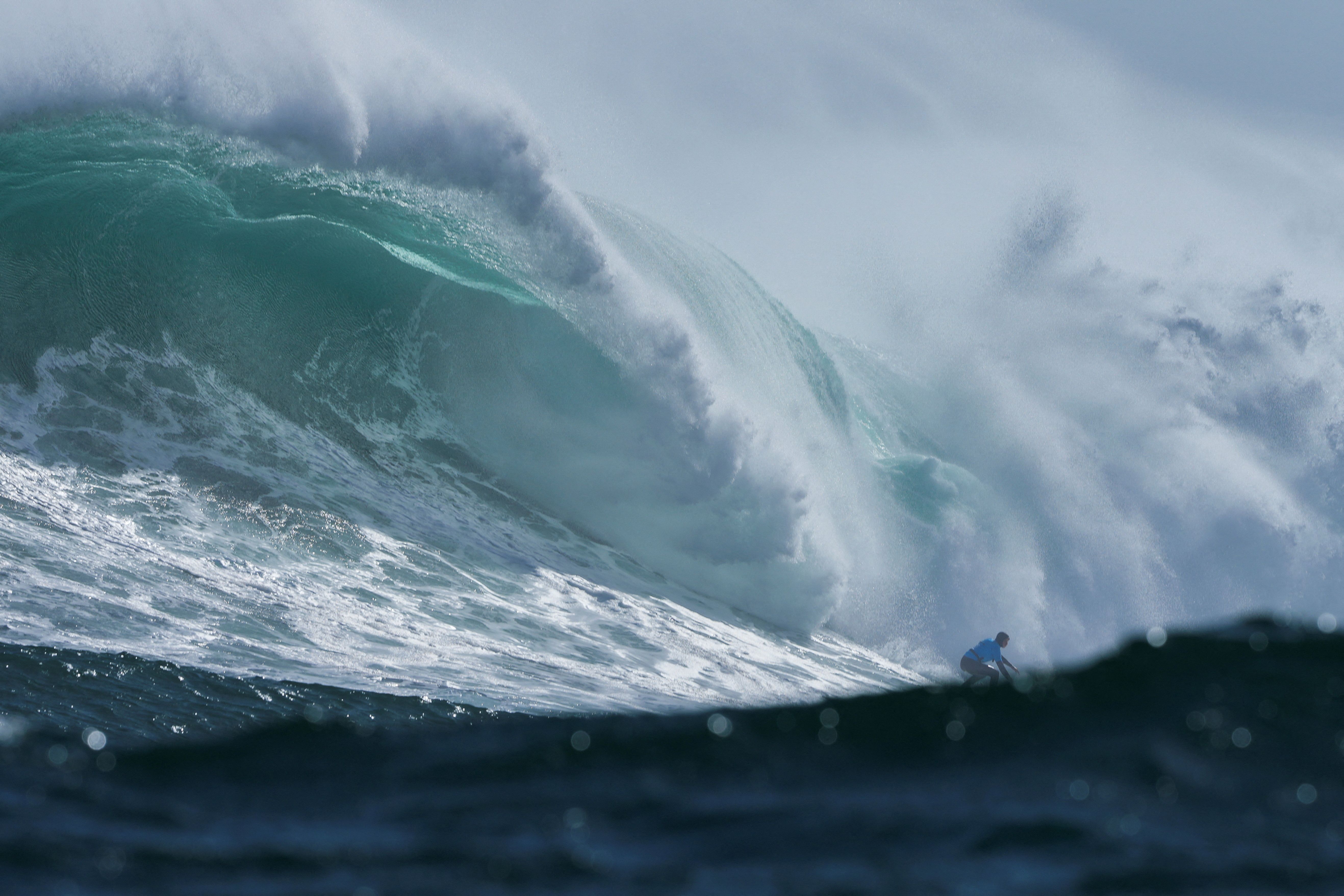 A surfer rides a wave at Dungeons offshore reef in the Atlantic ocean as seasonal cold fronts drive big swells into the Cape Peninsula in Cape Town, South Africa on August 18, 2024. (Photo by Nic Bothma/Reuters)