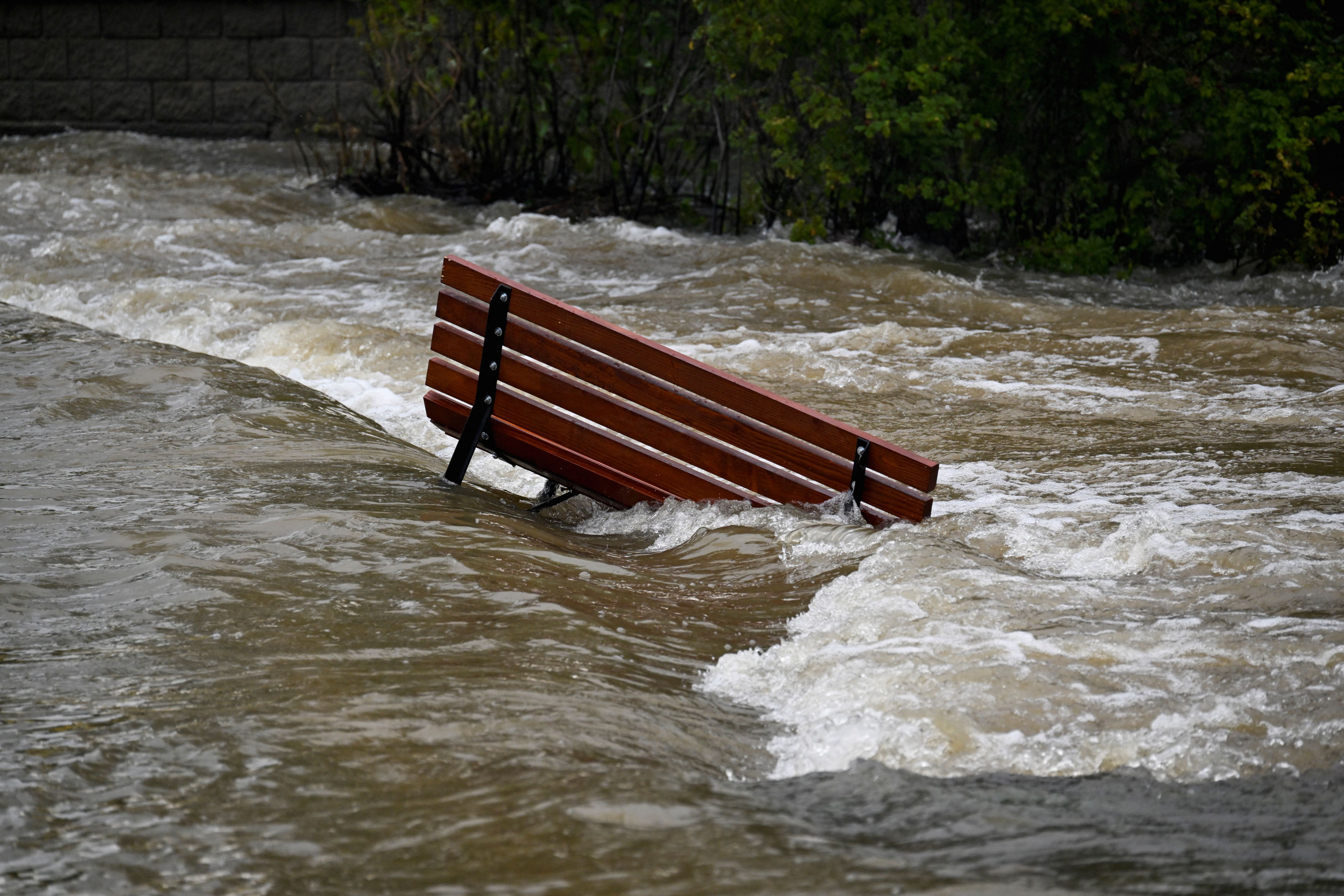 A view shows a partially submerged bench, following heavy rainfalls in Litovel, Czech Republic on September 16, 2024. (Photo by Radovan Stoklasa/Reuters)