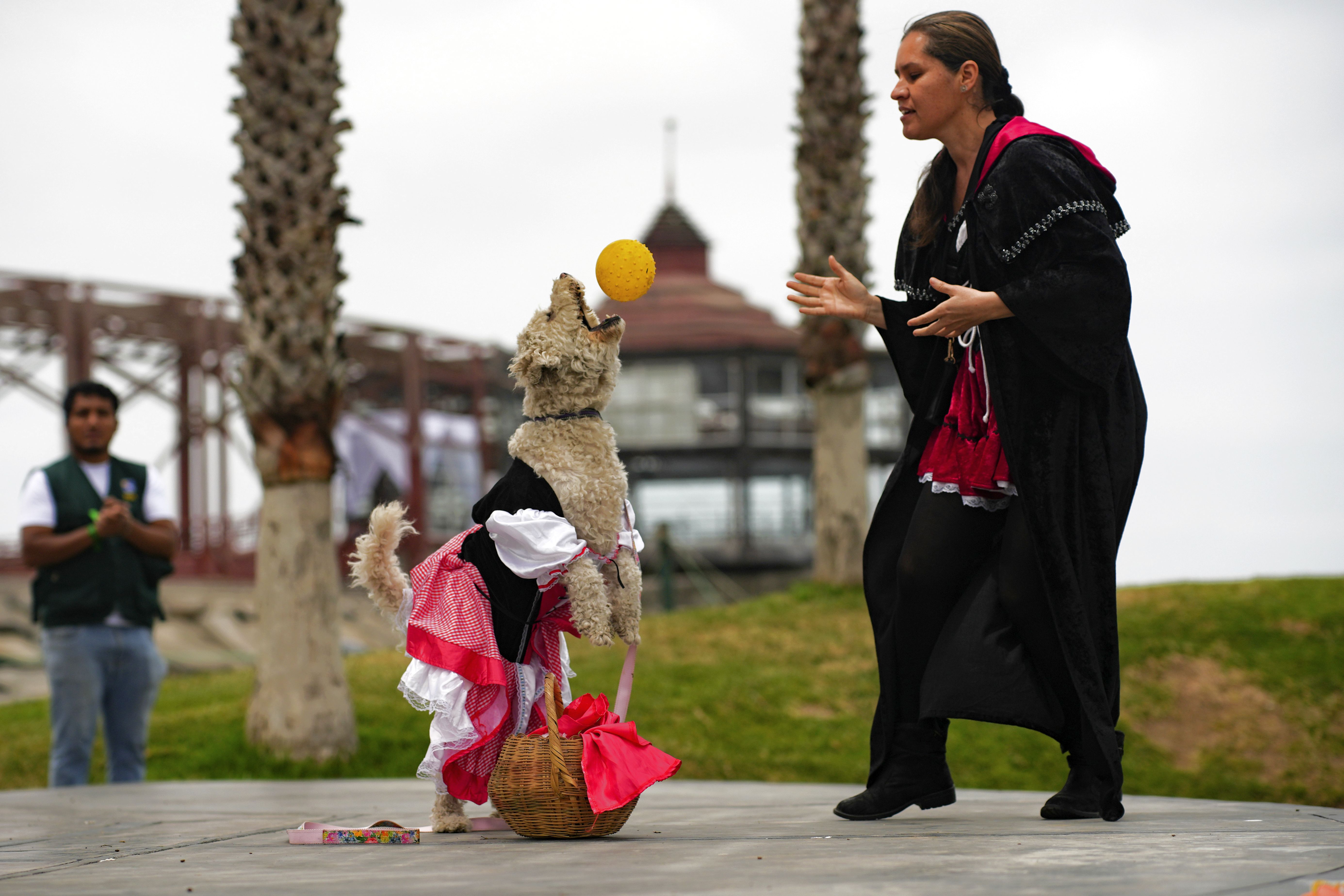 Malefica and her owner, Marisol Penafiel, participate in a halloween pet show in Callao, Peru, Sunday, October 27, 2024. (Photo by Guadalupe Pardo/AP Photo)