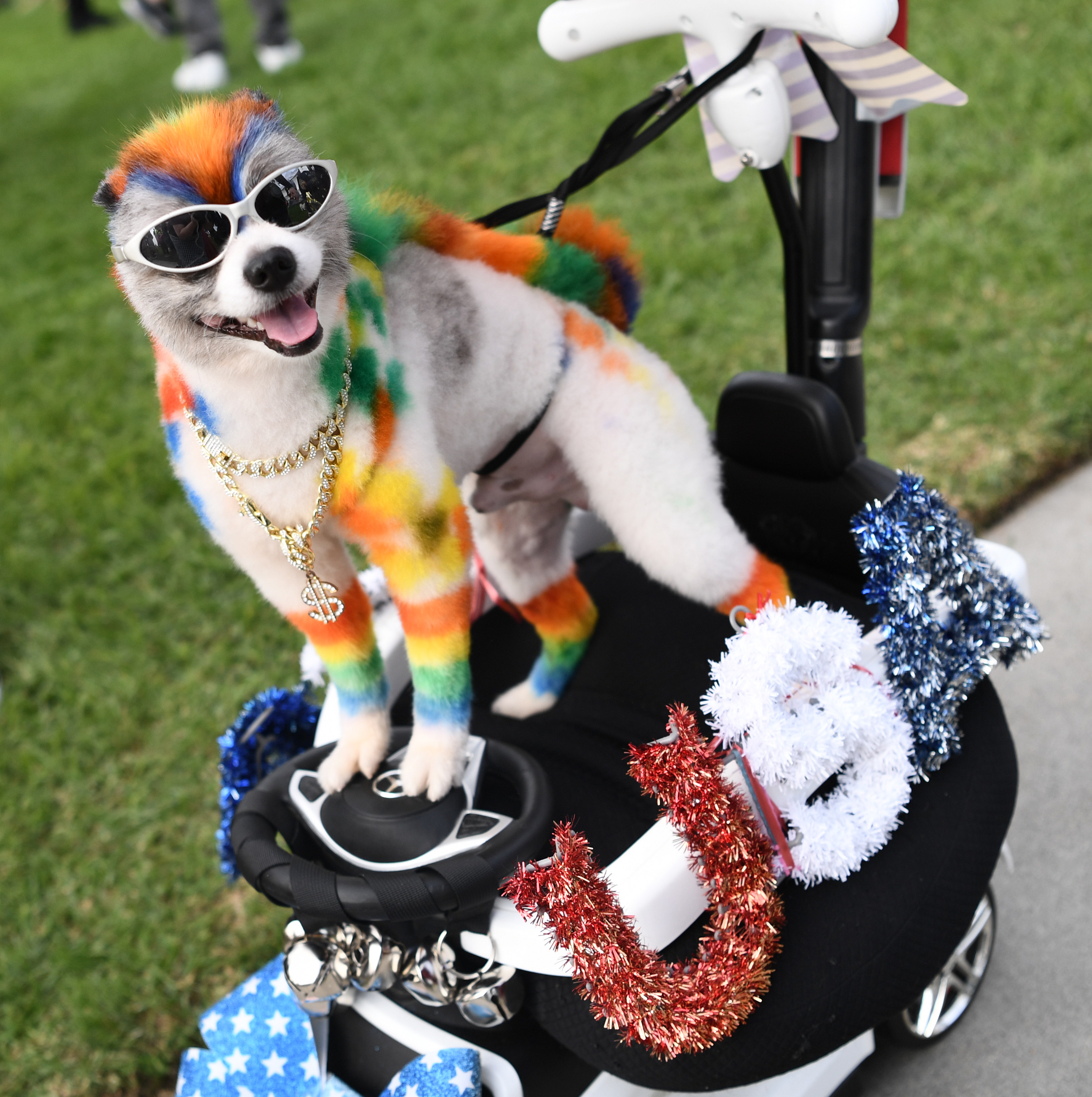 A dog dressed as a presidential candidate is seen during the Haute Dog Howl'oween Parade 2024 on October 27, 2024 in Long Beach, California. (Photo by Chelsea Guglielmino/Getty Images)