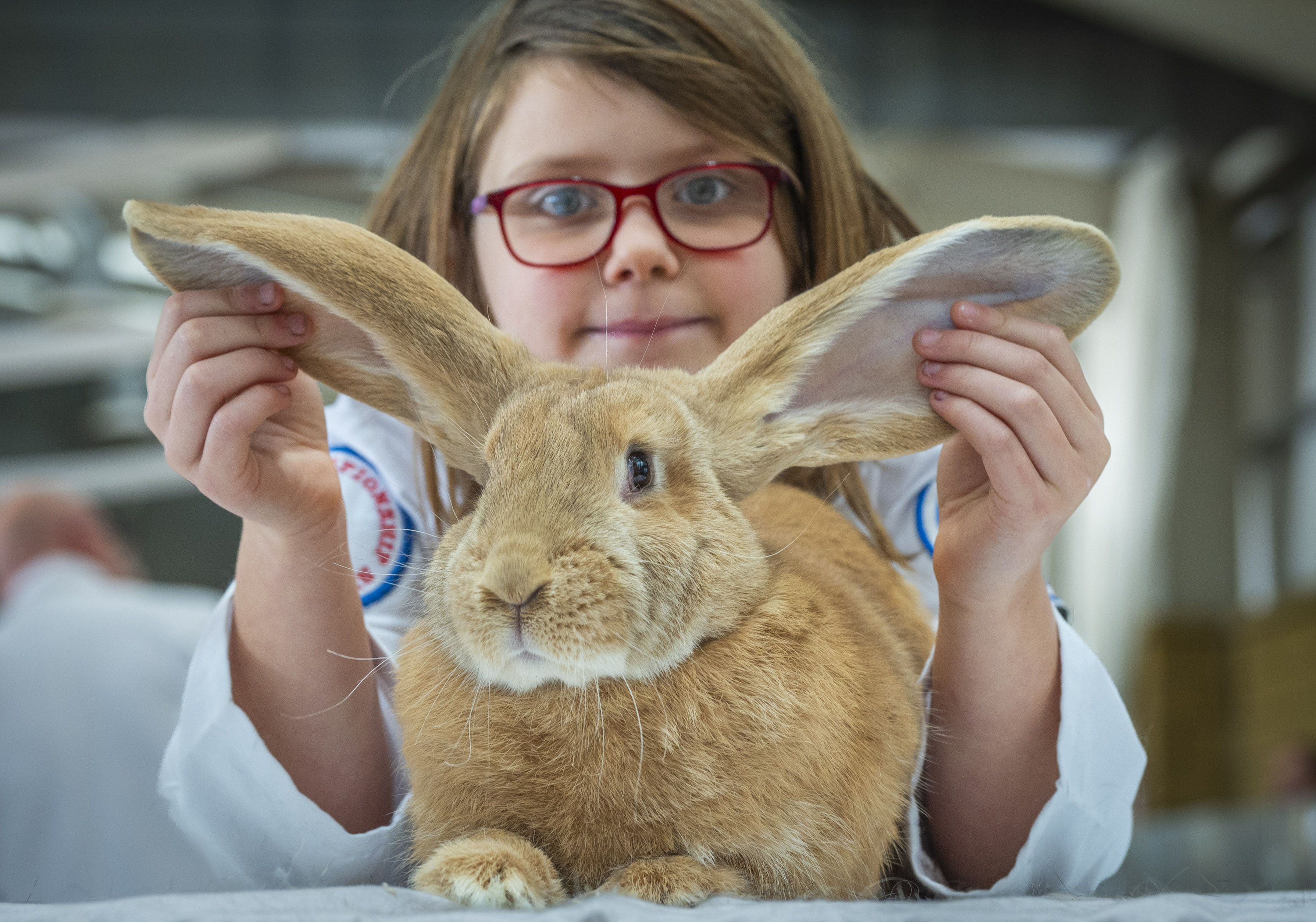 Rabbit owners from across the UK gather on October 26, 2024 in Kelso for the Scottish Rabbit Club 4* Championship, the largest event of its kind in the UK with about 500 rabbits competing, as nine-year-old Evie Cribge helps steward the judging of the giant continental rabbits. (Photo by Phil Wilkinson for the Times)