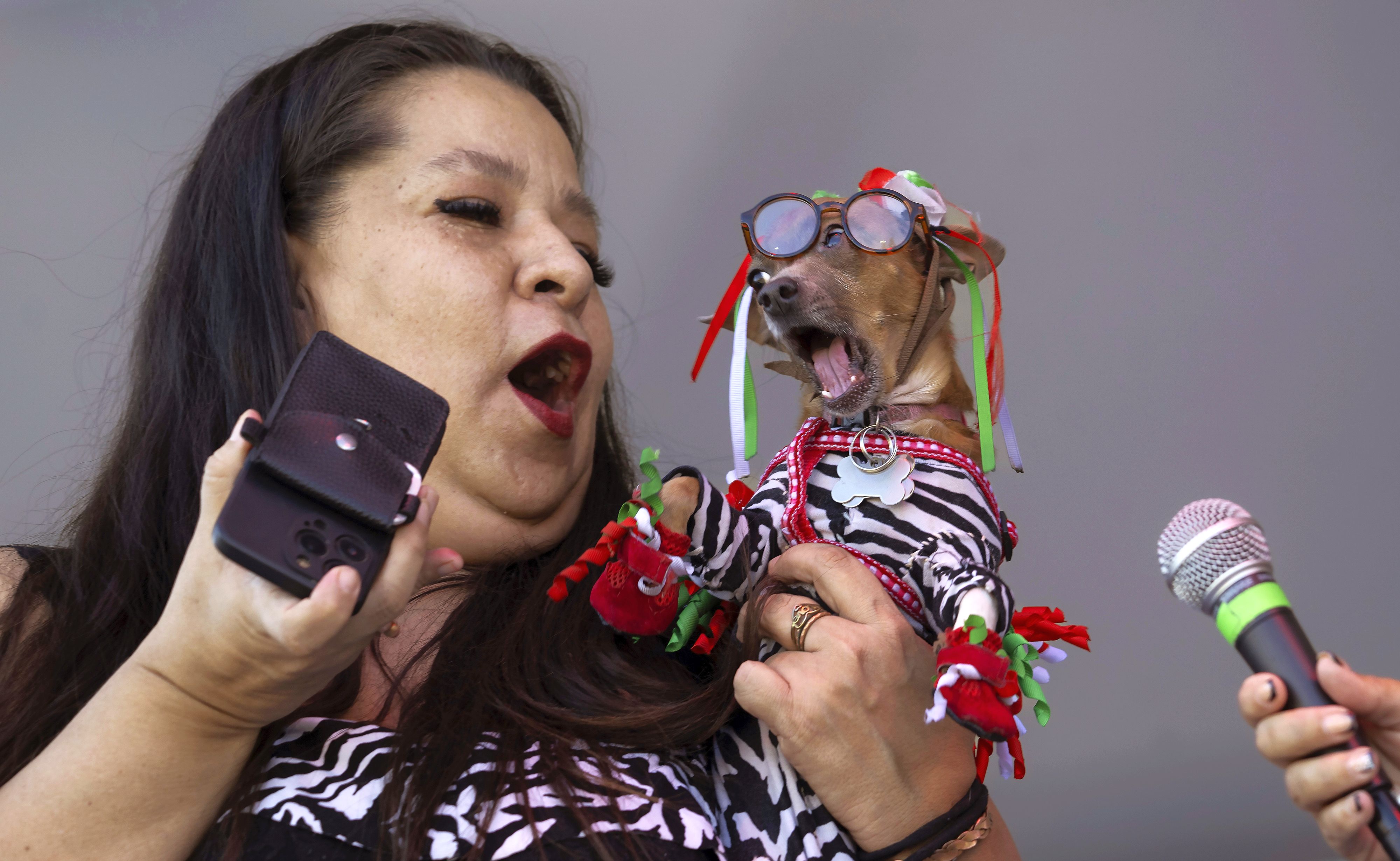 Lulu and her owner, Cynthia “the dog lady”, Lopez, perform a duet during the Silverado Days Mutt Show in Buena Park on Sunday, October 20, 2024. (Photo by Mindy Schauer/The Orange County Register via AP Photo)