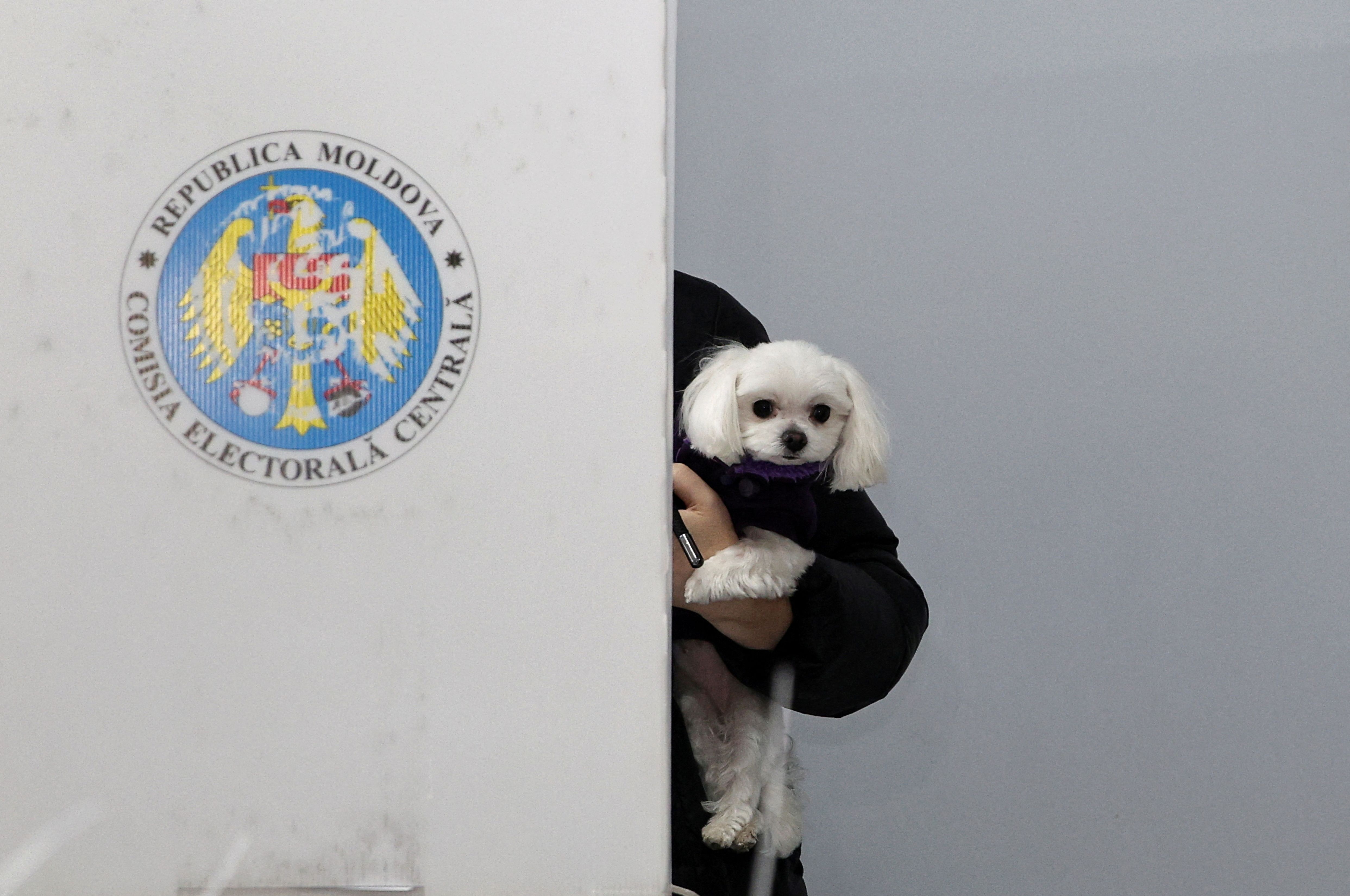A voter holds a dog while standing in a voting booth at a polling station, as the country holds a presidential election and a referendum on joining the European Union, in Chisinau, Moldova on October 20, 2024. (Photo by Vladislav Culiomza/Reuters)