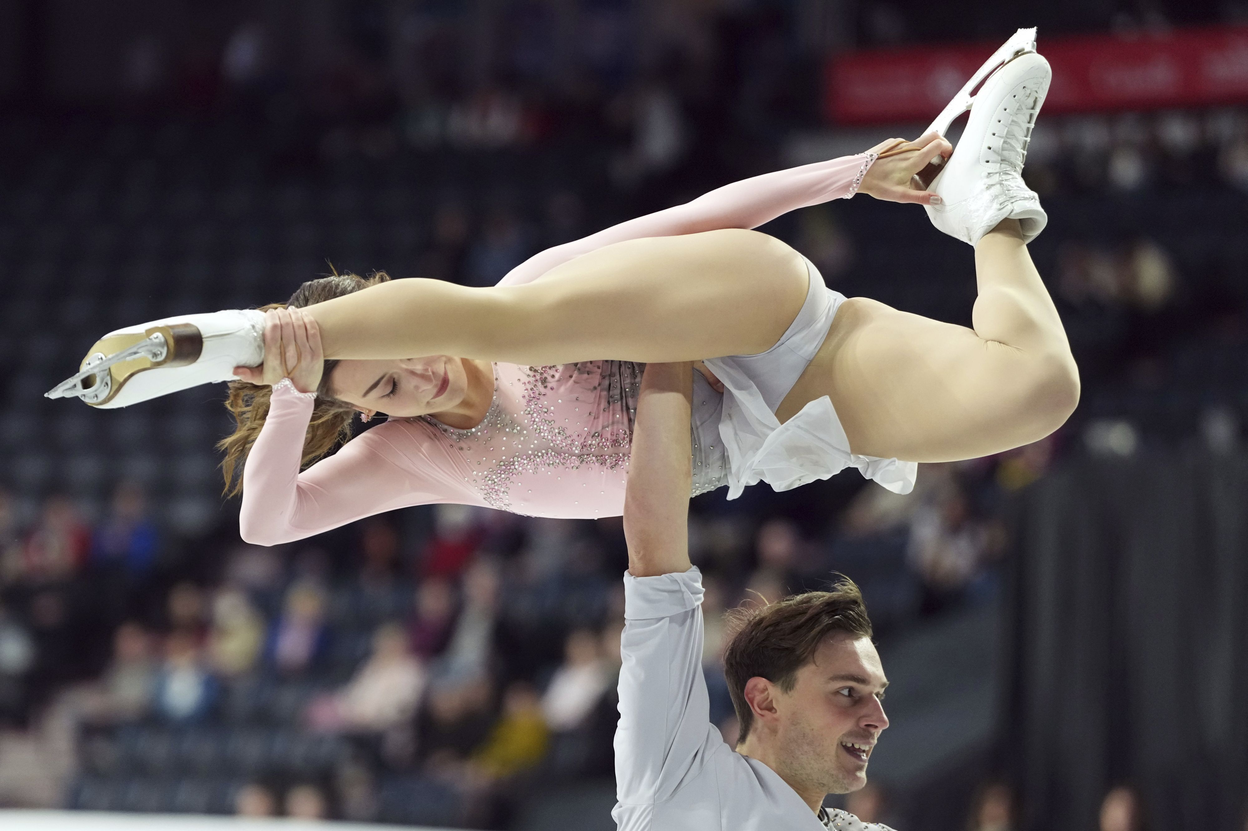 Daria Danilova and Michel Tsiba of the Netherlands compete in the pairs short program at the Skate Canada International figure skating competition in Halifax, Nova Scotia, Friday, October 25, 2024. (Photo by Darren Calabrese/The Canadian Press via AP Photo)