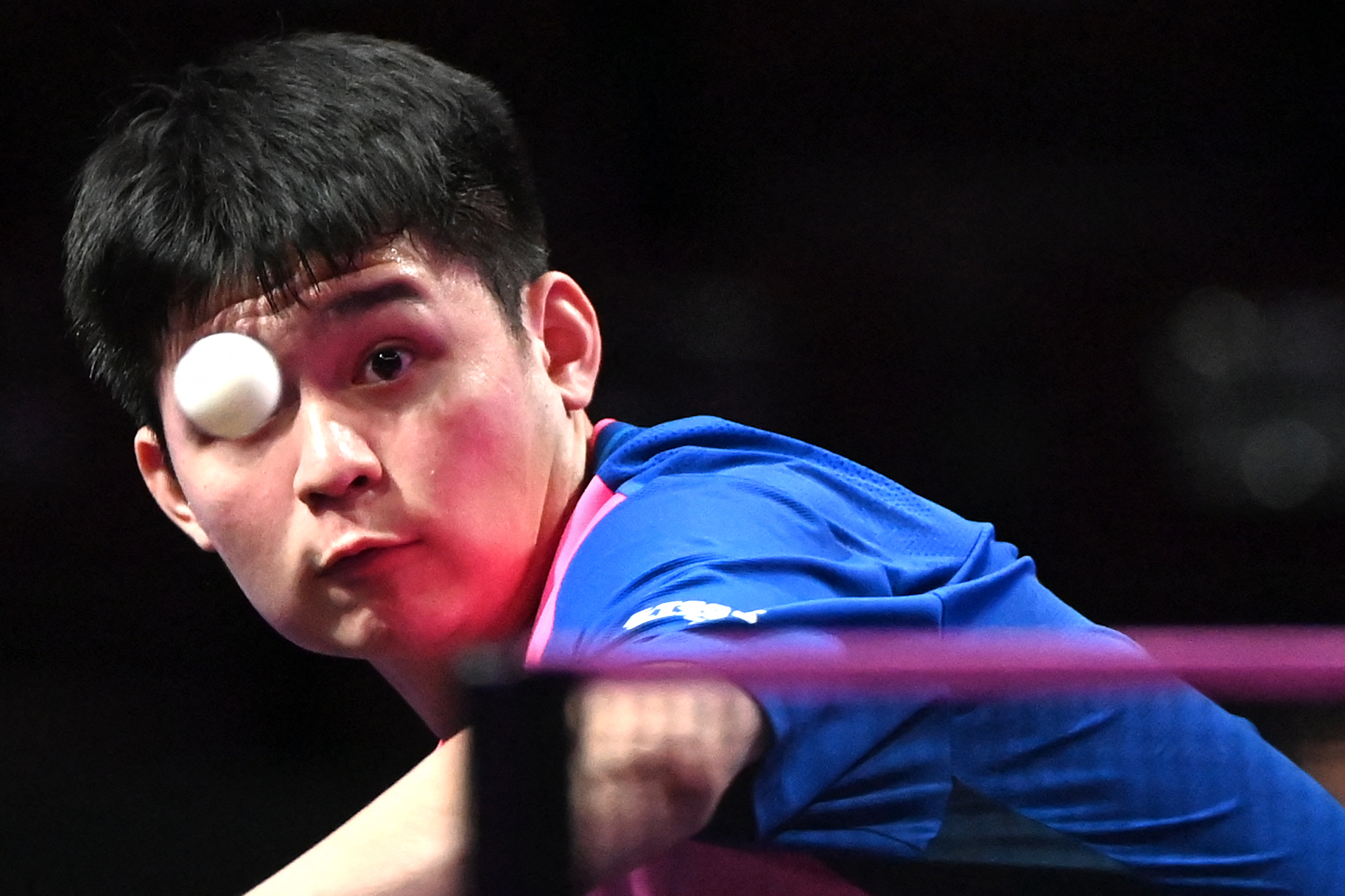 China's Lin Shidong eyes the ball as he plays against Spain's Alvaro Robles during their men's singles round of 32 table tennis match of the World Table Tennis (WTT) Champions Montpellier 2024 at the Sud de France Arena in Perols, near Montpellier, southern France, on October 23, 2024. (Photo by Sylvain Thomas/AFP Photo)