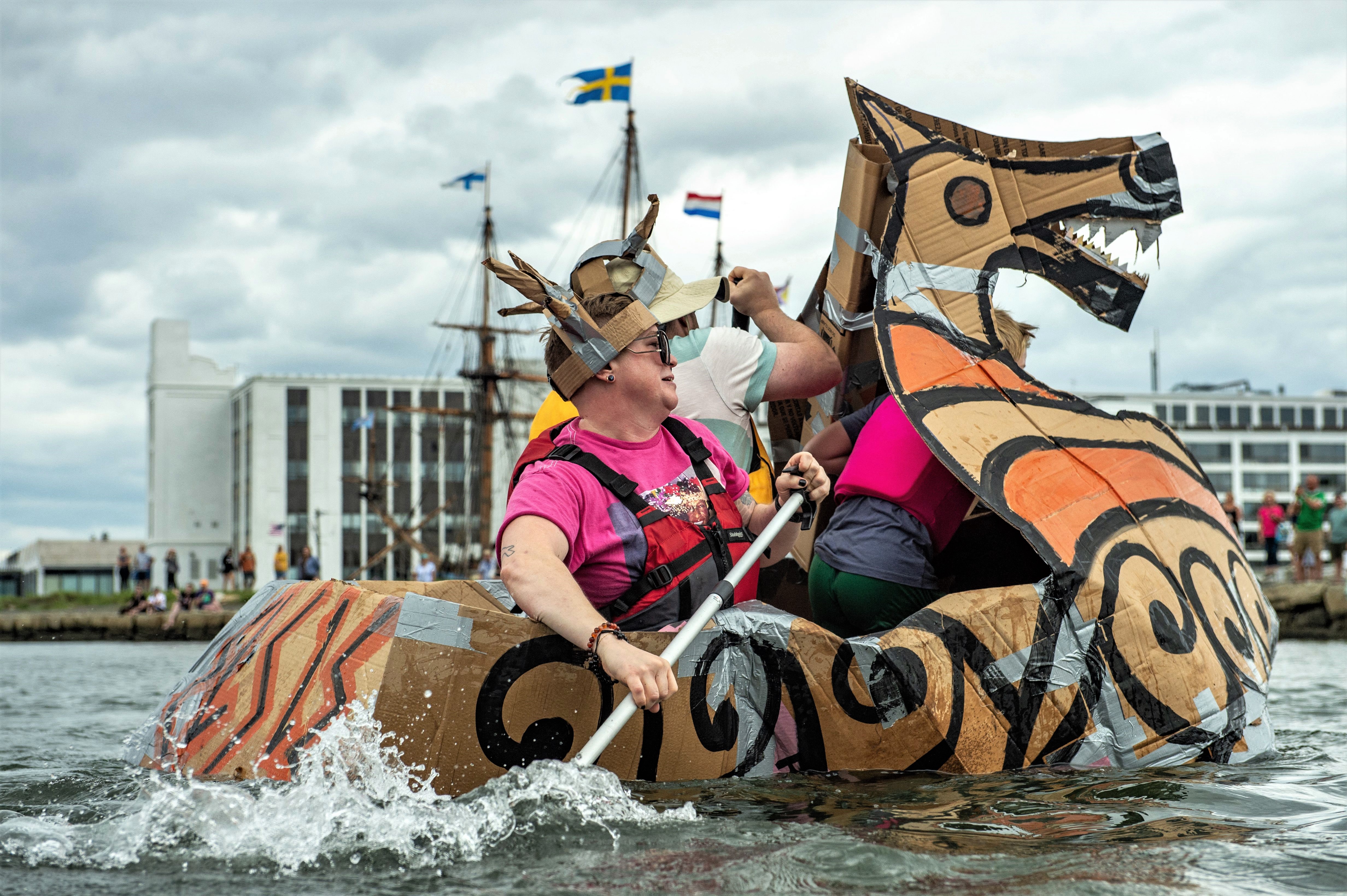 Competitors race during the Great Salem Maritime Cardboard Boat Regatta as part of the at Salem Merry-time Fest in Salem, Massachusetts on August 19, 2023. The custom boats made from corrugated cardboard and duct tape, must fit at least two people and compete in a set of heats, racing from Derby Beach to a buoy and back to the beach to win prizes. (Photo by Joseph Prezioso/AFP Photo)