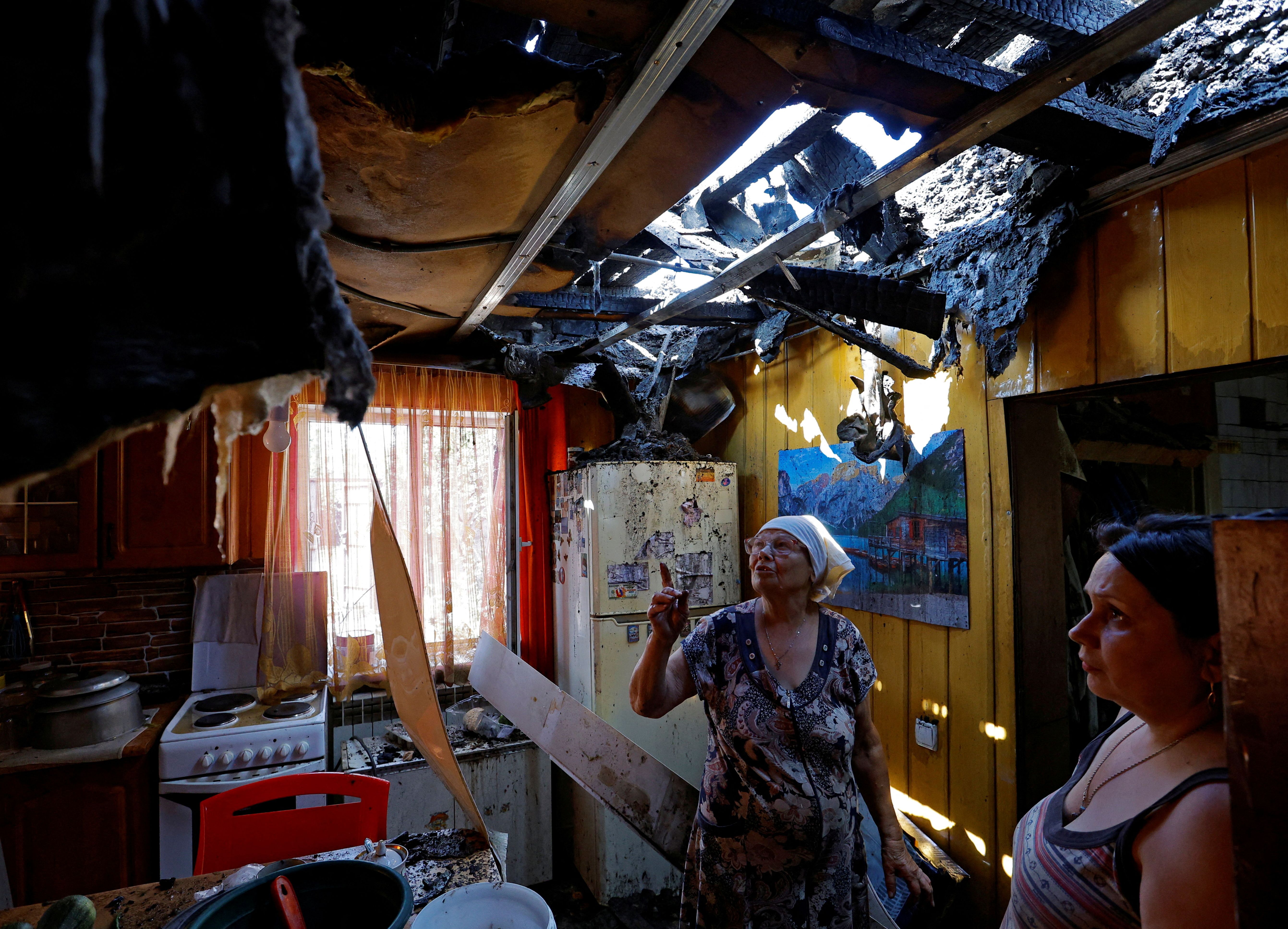 Local resident Olga Paramonova, 49, and her mother Natalia look at the destroyed roof of their house damaged by recent shelling in the course of Russia-Ukraine conflict in Donetsk, Russian-controlled Ukraine on August 8, 2023. (Photo by Alexander Ermochenko/Reuters)