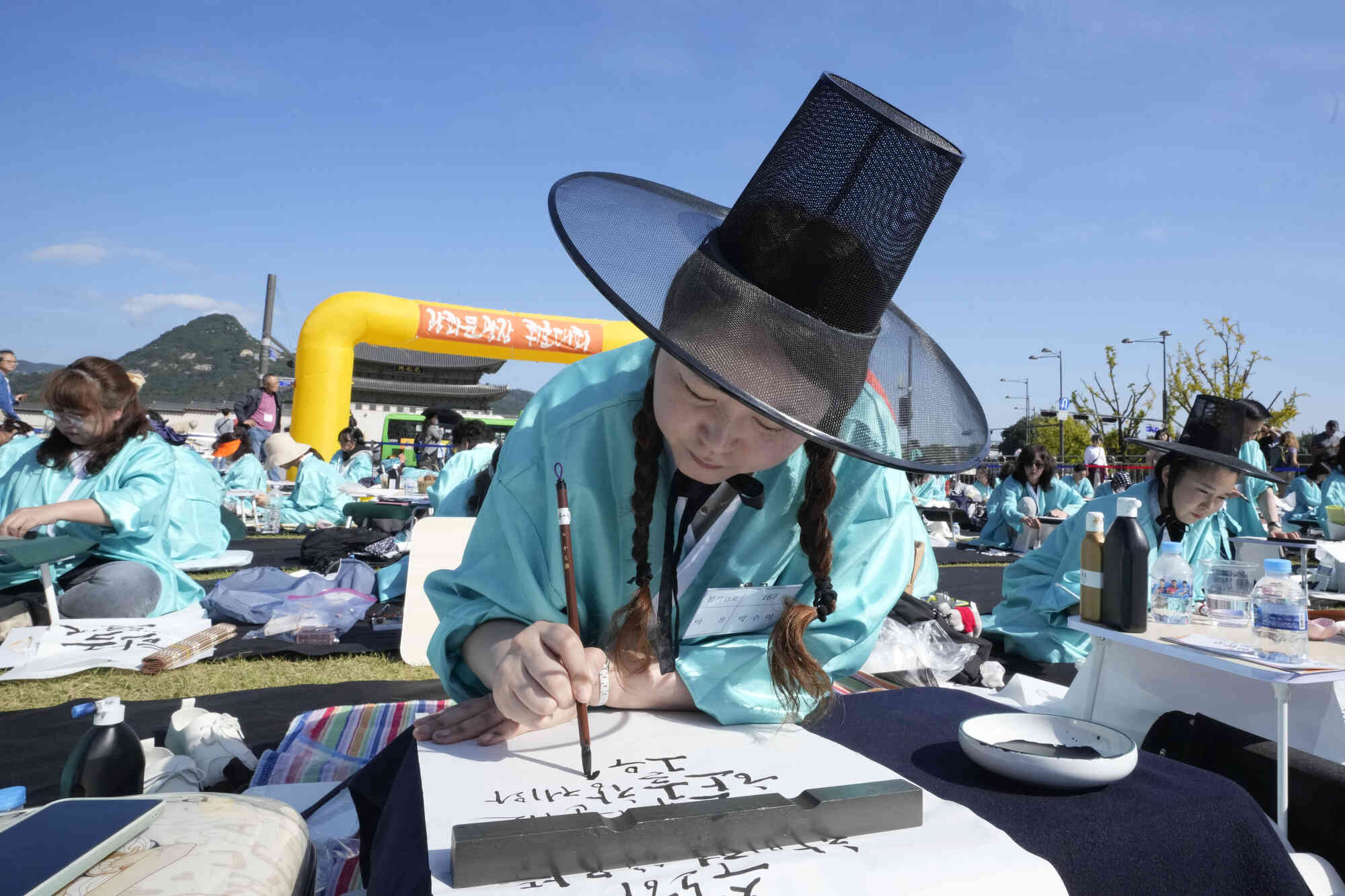 South Korean woman Park Soo-mi takes part in a Korean calligraphy contest as part of events to celebrate the 578th anniversary of the creation of the Korean alphabet, Hangeul, in Seoul, South Korea, Wednesday, October 9, 2024. (Photo by Ahn Young-joon/AP Photo)