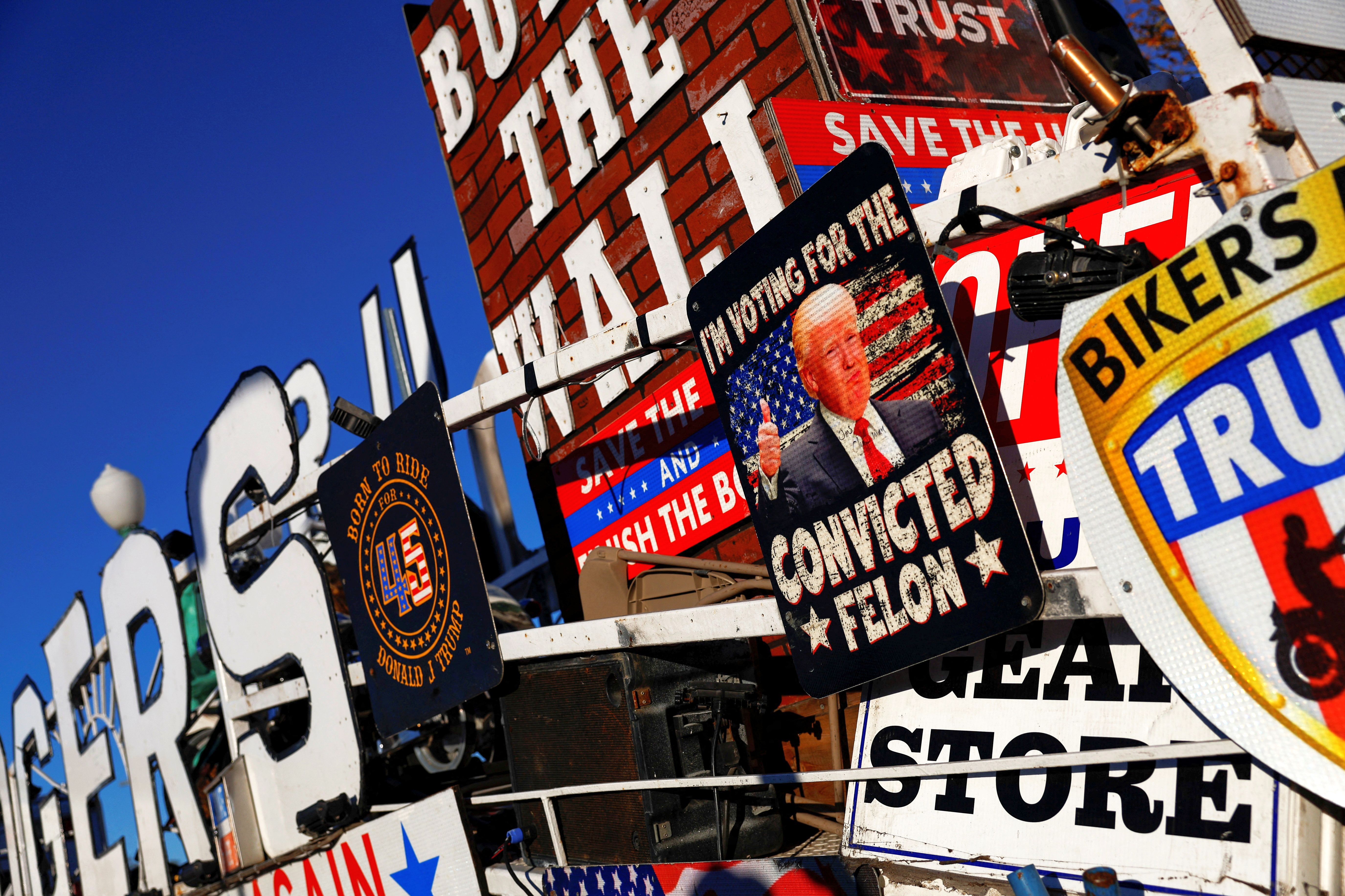 A view shows signs on the day of a campaign event for Republican presidential nominee and former U.S. President Donald Trump, in Novi, Michigan, U.S., October 26, 2024. (Photo by Shannon Stapleton/Reuters)