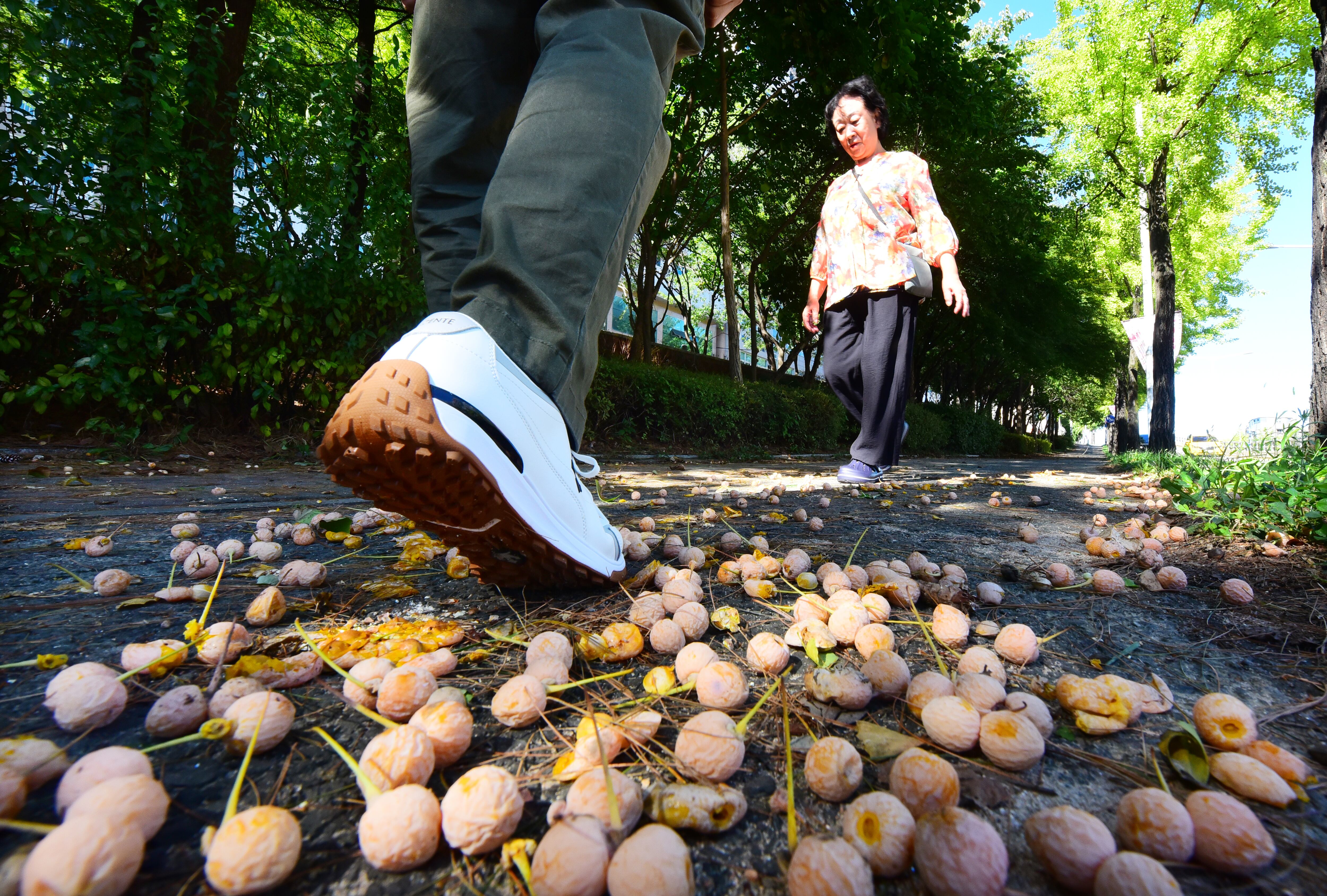 On the 23rd, 2024 a ginkgo tree fruit that fell on a sidewalk in Galma-dong, Seo-gu, Daejeon, is being stepped on by pedestrians, emitting a foul odor. (Photo by Shin Hyeon-jong)