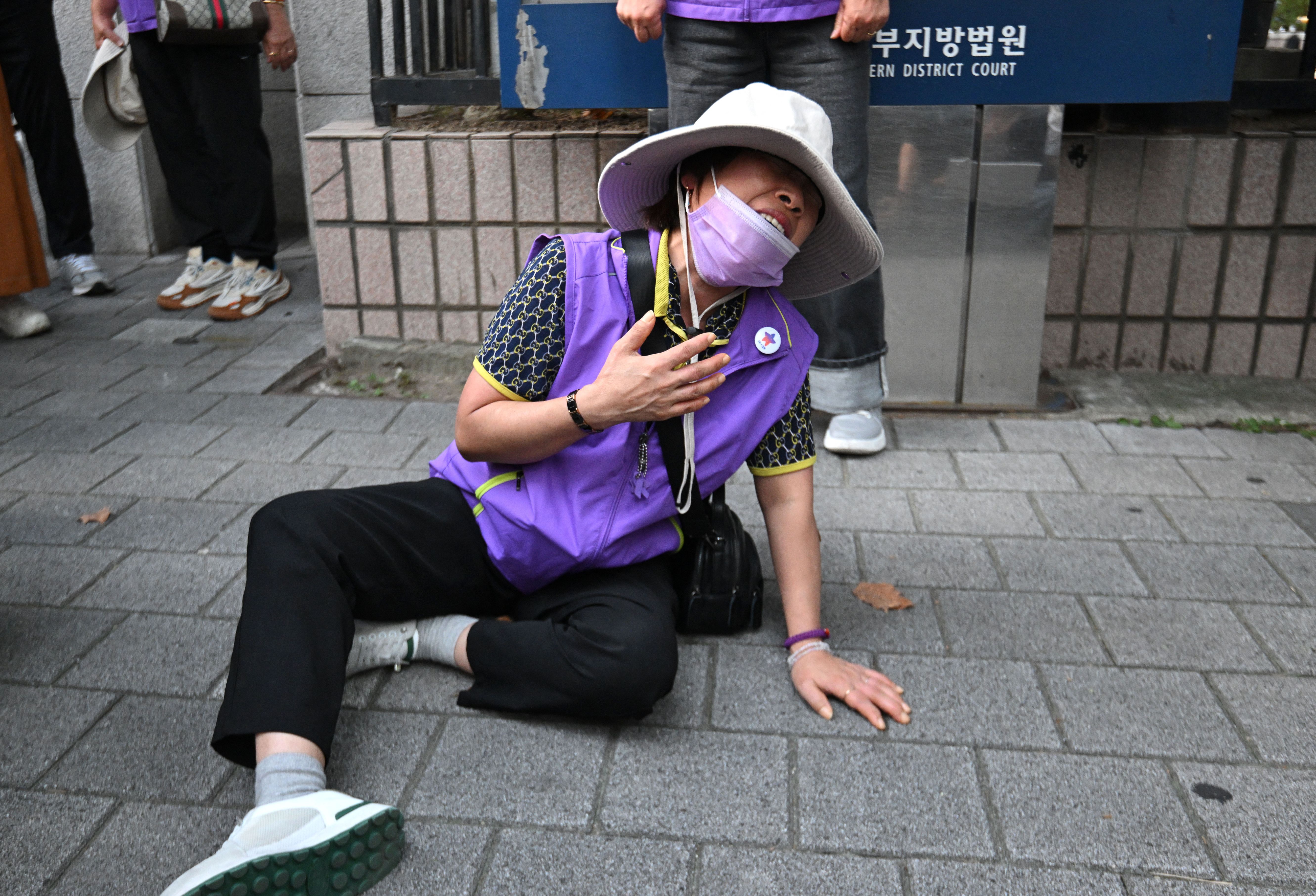 A family member of Itaewon crush victims cries at the Seoul Western District Court in Seoul on September 30, 2024, after Yongsan-gu District Office mayor Park Hee-young was found not guilty in the Itaewon disaster case. A South Korean court handed a three year jail term September 30 to a former Seoul district police chief over a crush that killed more than 150 people, the Yonhap news agency reported. The Seoul court, however, found local official Park Hee-young, head of the Yongsan Ward office, not guilty on similar charges. (Photo by Jung Yeon-je/AFP Photo)
