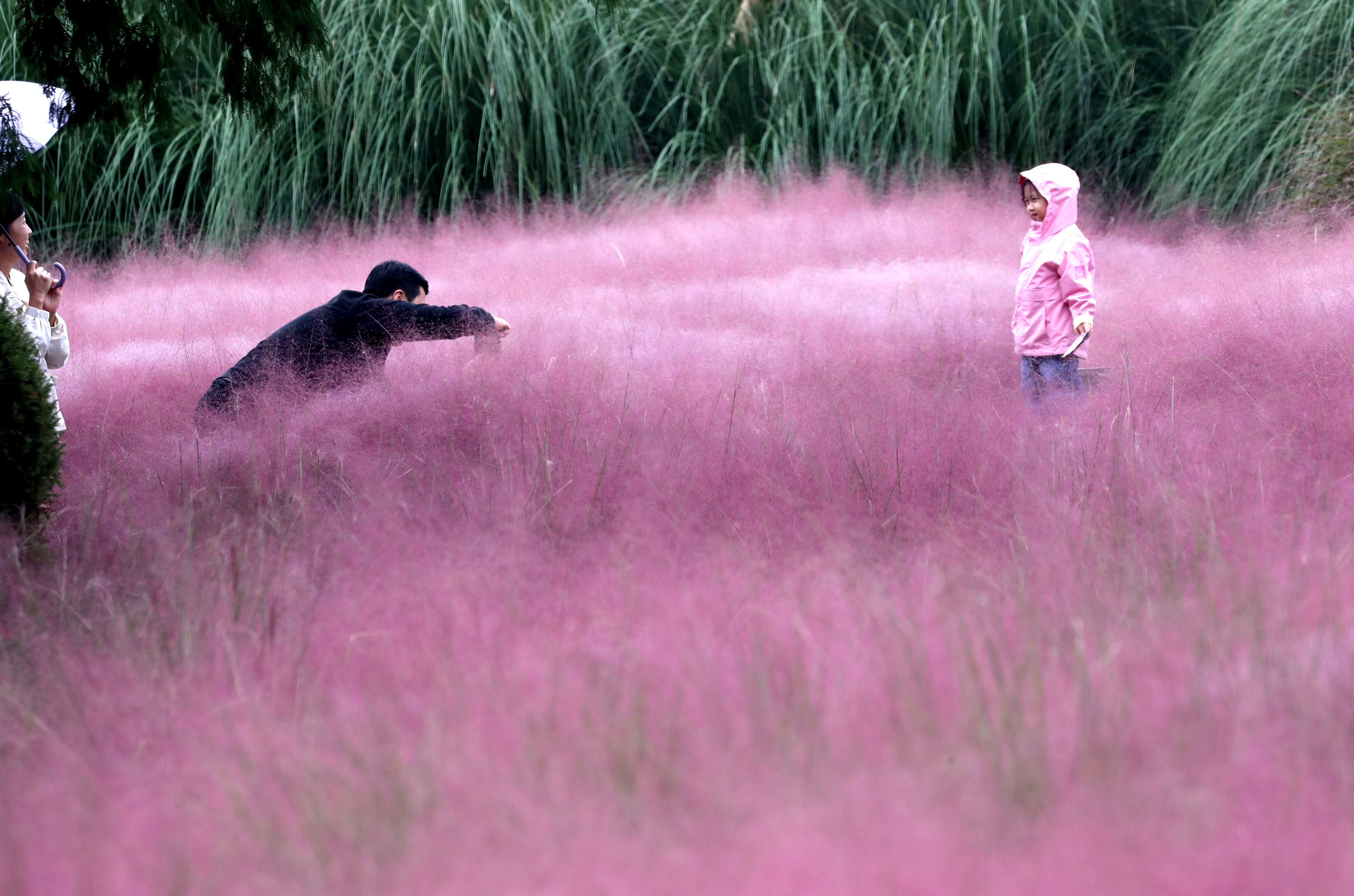 A family visiting the Taean Cheongsan Arboretum in South Chungcheong Province on the 6th October 2024 is enjoying autumn while taking pictures with the pink muhly in the background. (Photo by Shin Hyeon-jong)
