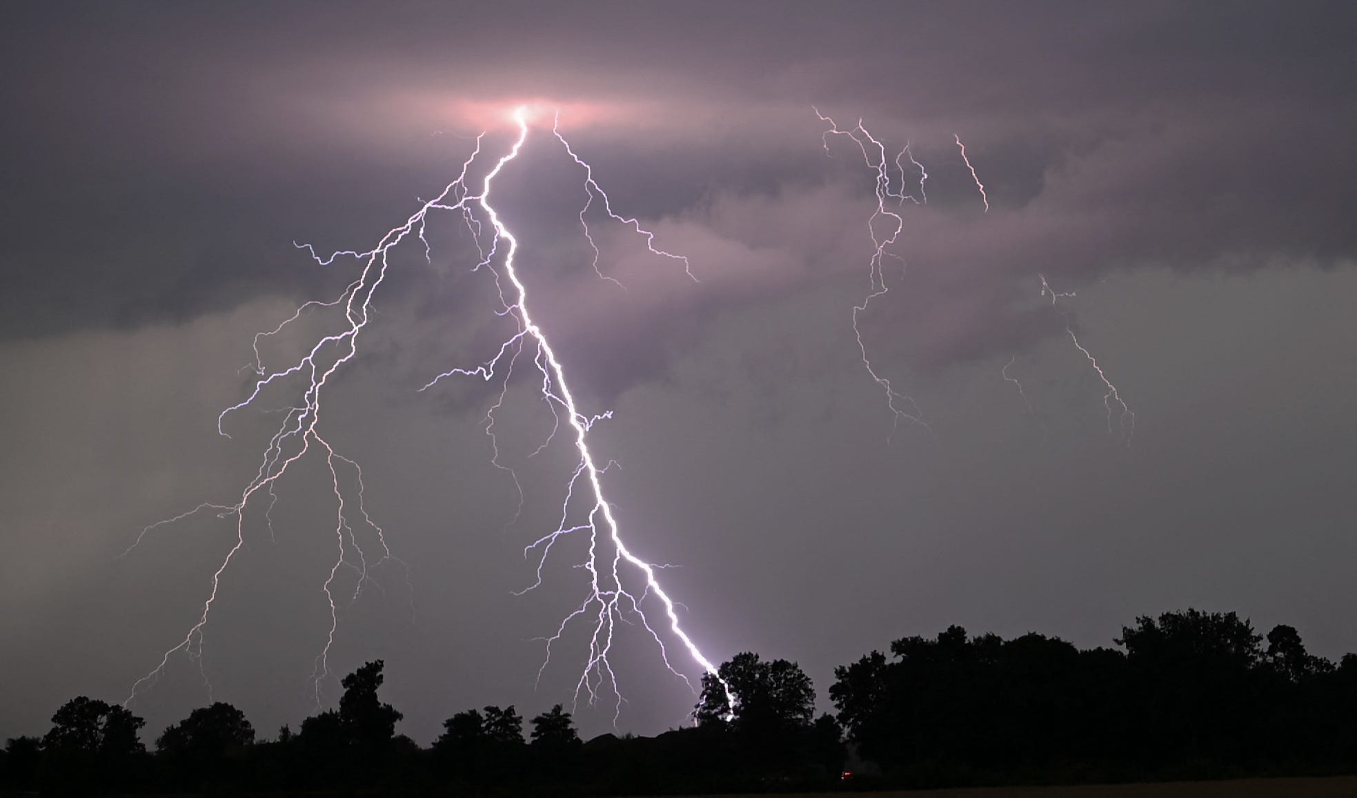 Lightning strikes over the countryside during a thunderstorm following high temperatures on July 10, 2024 near Potsdam, eastern Germany. (Photo by Ralf Hirschberger/AFP Photo)