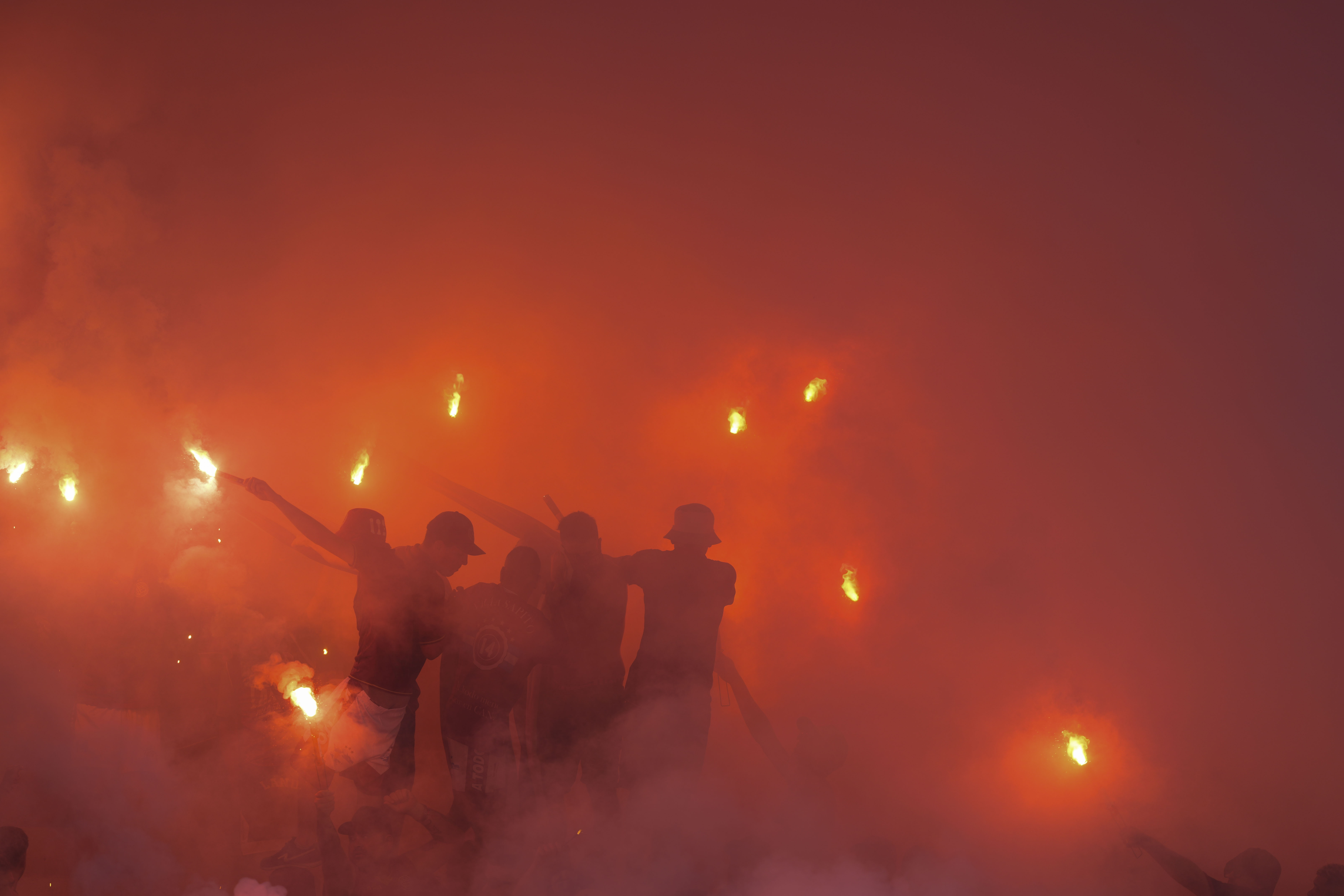 Fans of Argentina's Lanus launch fireworks before the start of a Copa Sudamericana semifinal second leg soccer match against Brazil's Cruzeiro at La Fortaleza Stadium in Buenos Aires, Argentina, Wednesday, October 30, 2024. (Photo by Natacha Pisarenko/AP Photo)