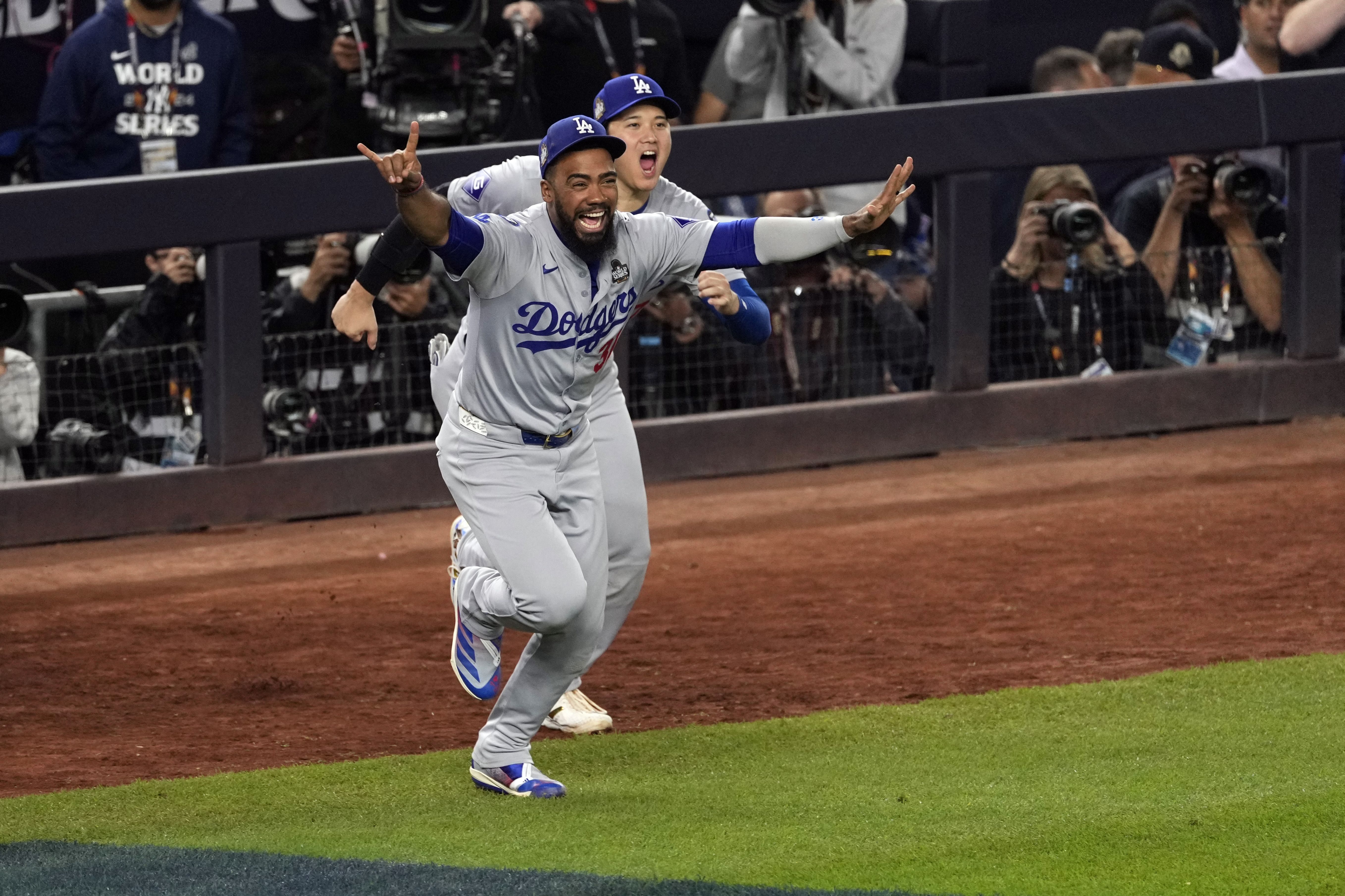 Los Angeles Dodgers' Teoscar Hernández (37) and Shohei Ohtani celebrate after the Dodgers beat the New York Yankees in Game 5 to win the baseball World Series, Wednesday, October 30, 2024, in New York. (Photo by Seth Wenig/AP Photo)