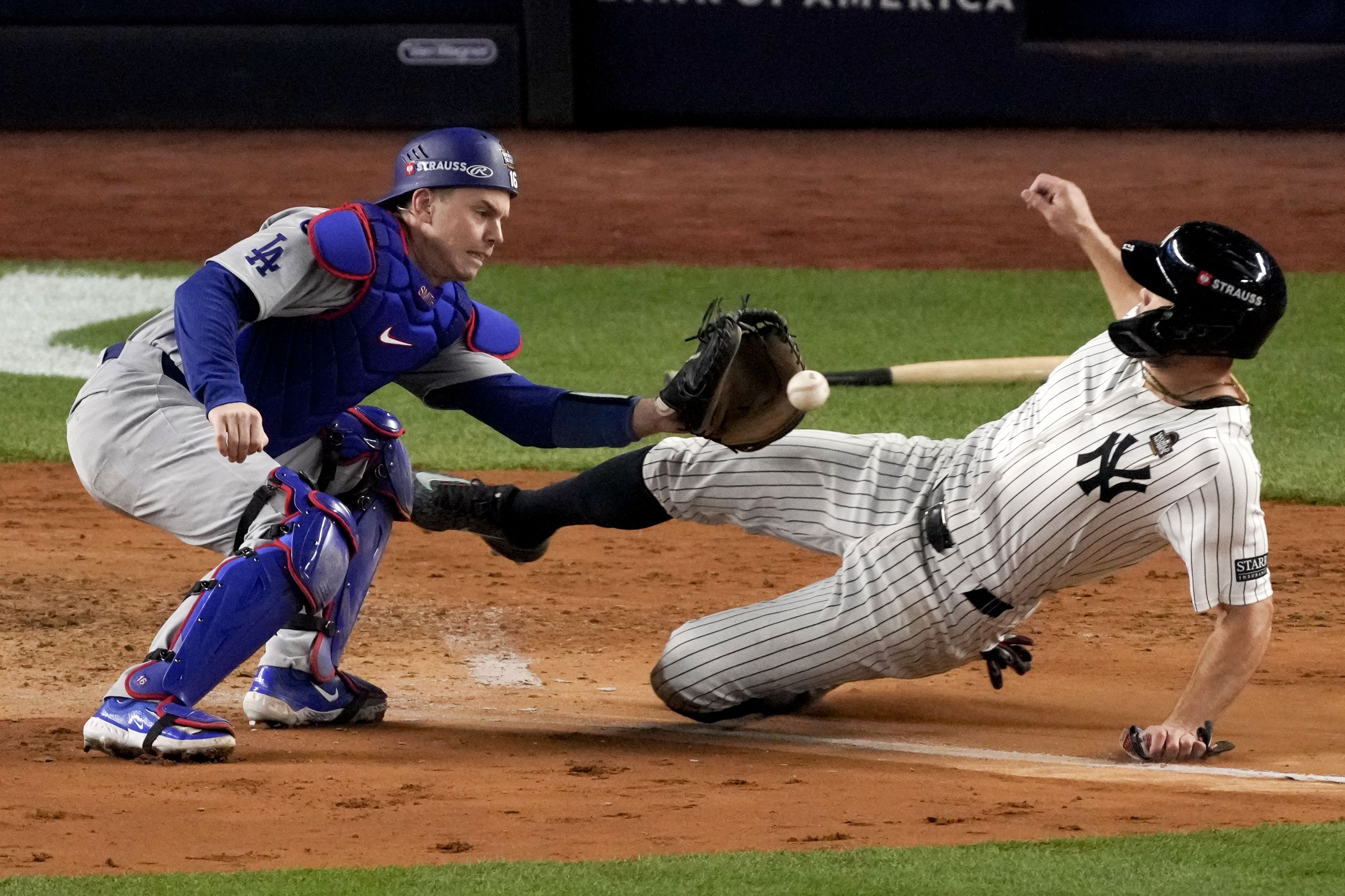 New York Yankees' Giancarlo Stanton is tagged out at home by Los Angeles Dodgers catcher Will Smith during the fourth inning in Game 3 of the baseball World Series, Monday, October 28, 2024, in New York. (Photo by Frank Franklin II/AP Photo)