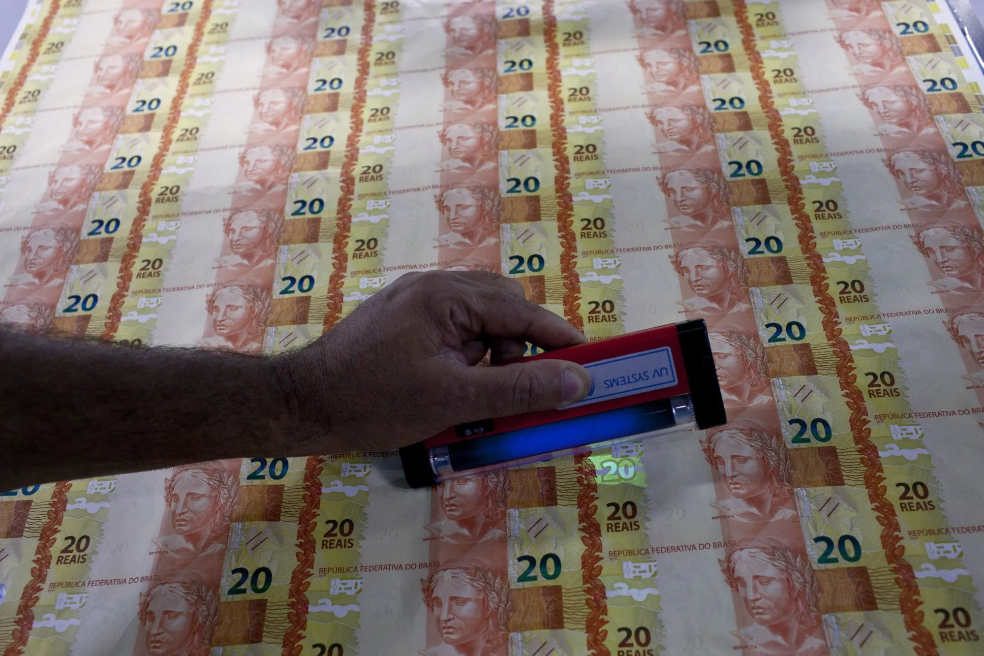 A worker checks the security feature on prints of R$ 20 Brazilian reais bills during the production process at the Casa da Moeda, the national mint, in the Santa Cruz suburb of Rio de Janeiro, Brazil, on Tuesday, March 5, 2013. Brazil is likely to keep its key interest rate at a record low for the third straight meeting, as policy makers are caught between a fragile economic recovery and faster-than-expected inflation. (Photo by Dado Galdieri/Bloomberg)