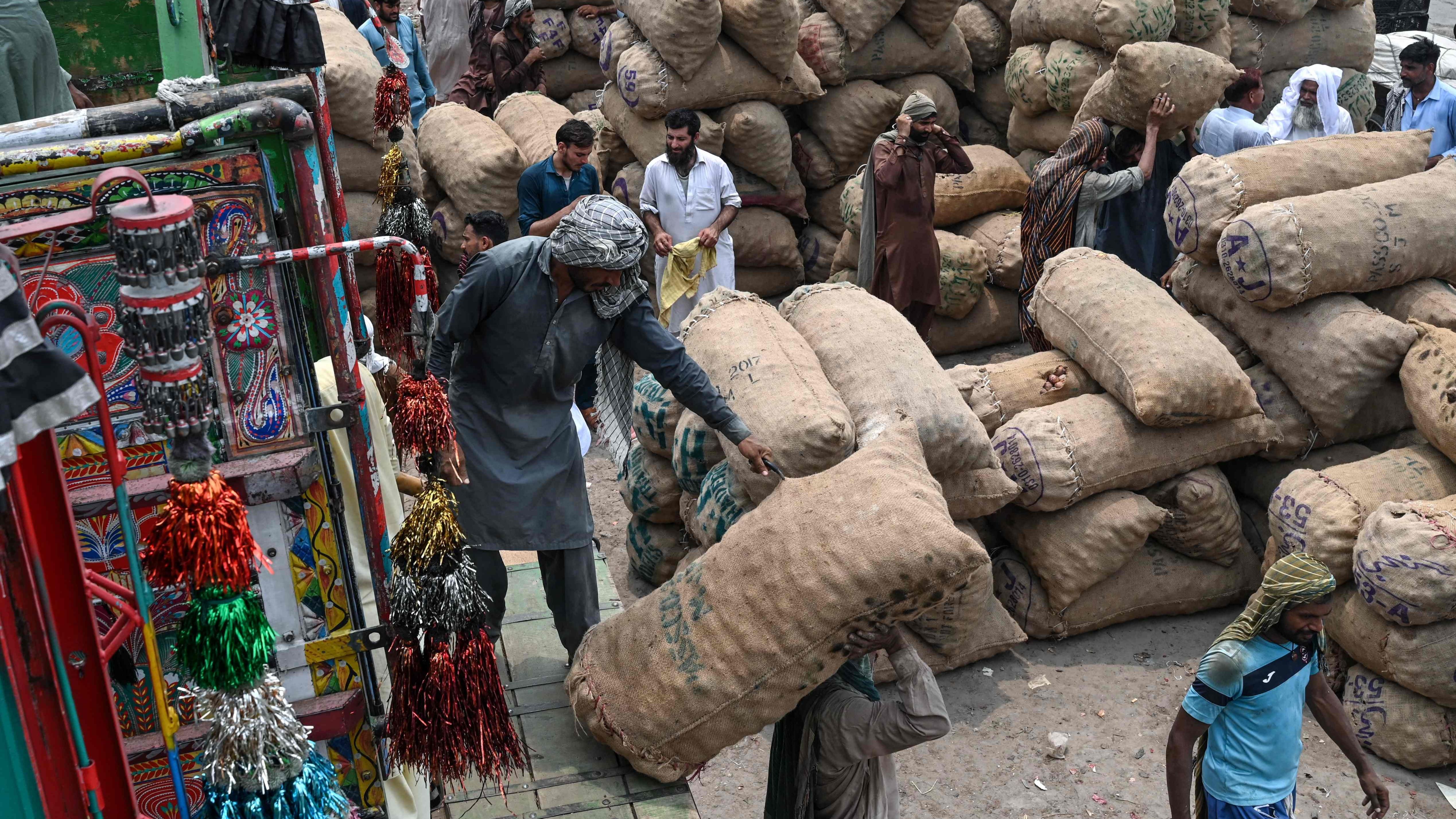 Labourers unload sacks of potatoes from a truck at a local market in Lahore on July 9, 2024. (Photo by Arif Ali/AFP Photo)
