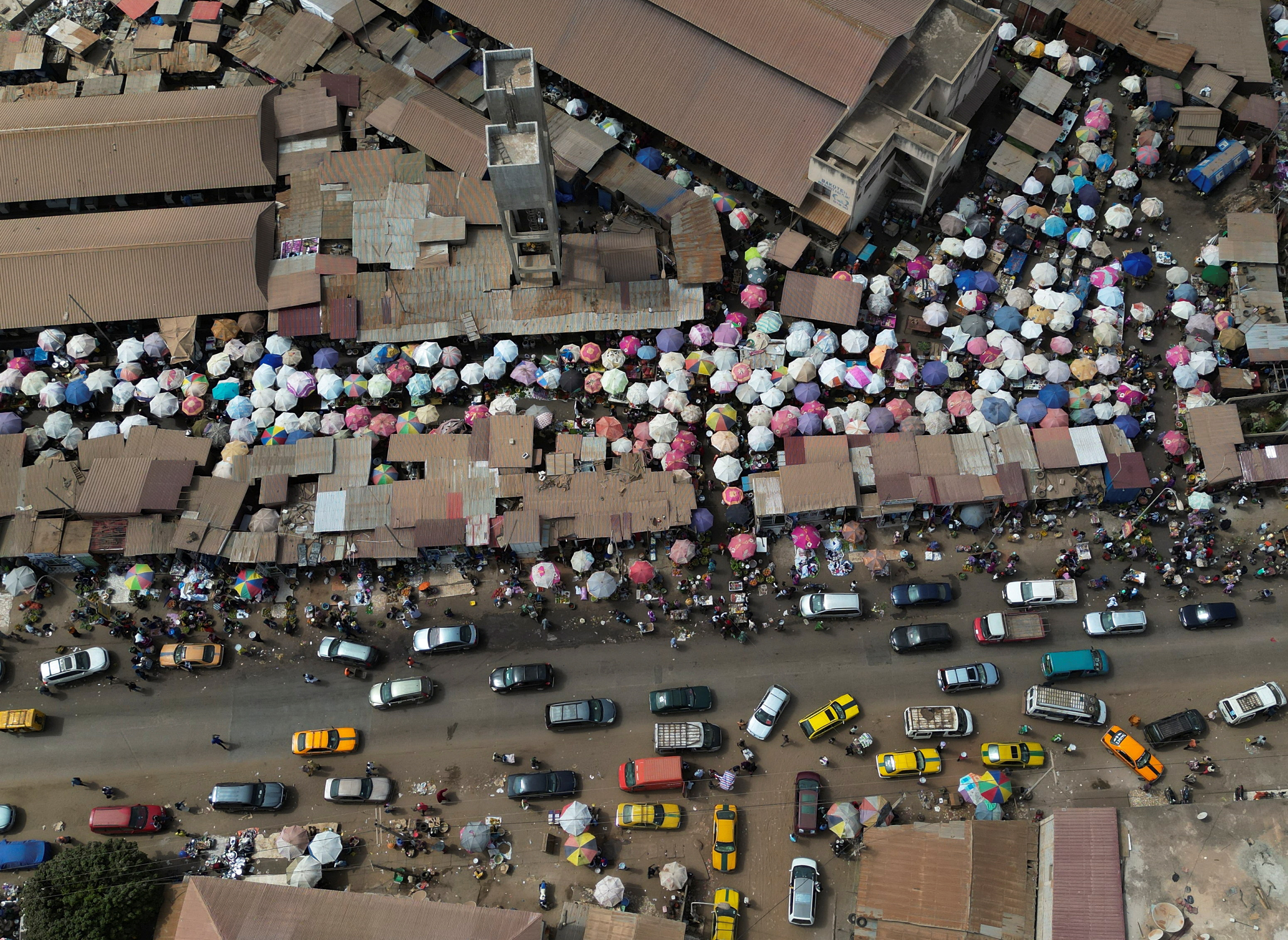 A drone view shows Bakoteh market in Serekunda, on the outskirts of Banjul, Gambia, on June 7, 2024. (Photo by Zohra Bensemra/Reuters)